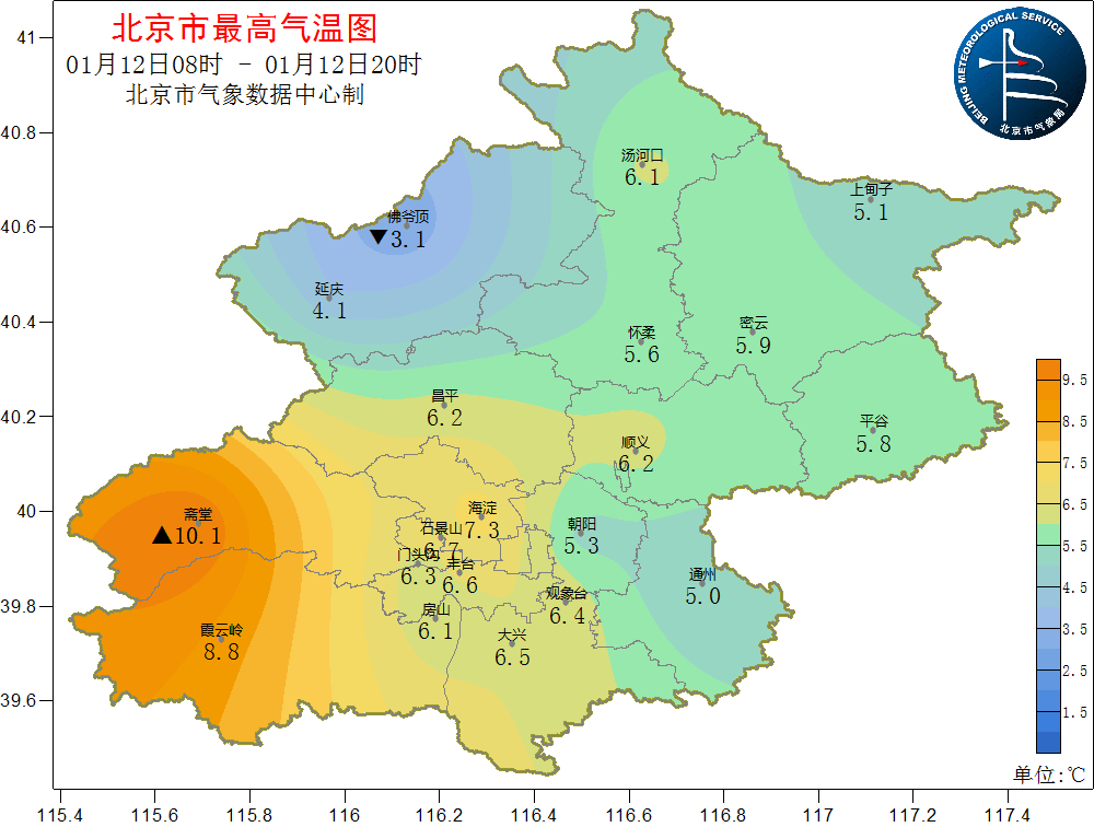 12日08时到12日20时,南郊观象台最高气温6.4℃(12日15:01)