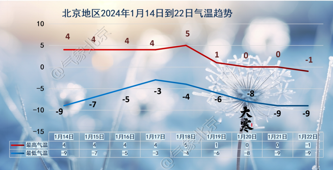 14日夜间:晴;偏北风1、2级;平原地区最低气温-9℃,山区最低气温-14~-11℃。