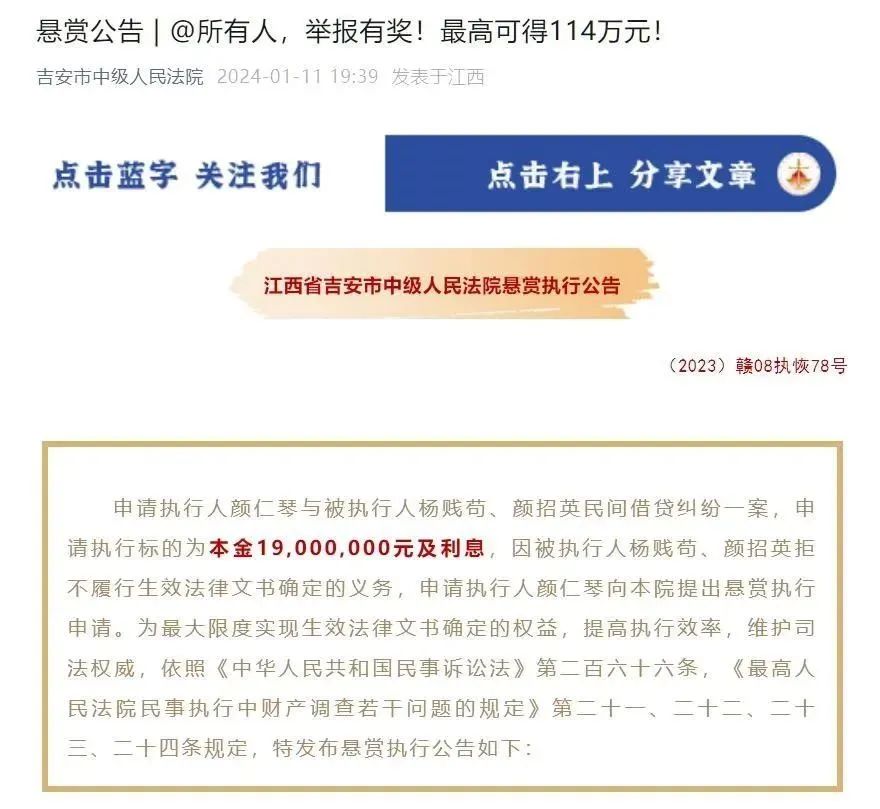 2024年1月11日,江西省吉安市中级人民法院发布一份百万悬赏执行公告。