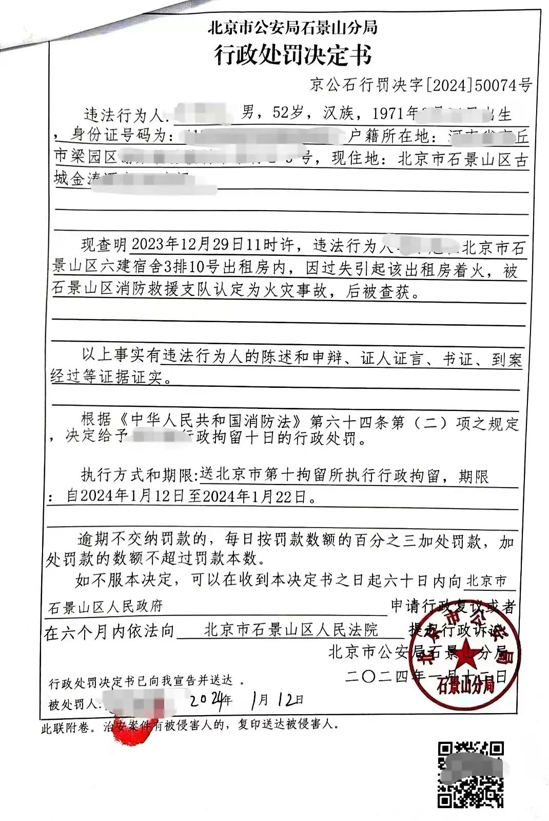 近日,小石从北京市石景山区消防救援支队获悉,一名男子因酒后卧床吸烟引发火灾,被警方处以10日行政拘留的处罚。