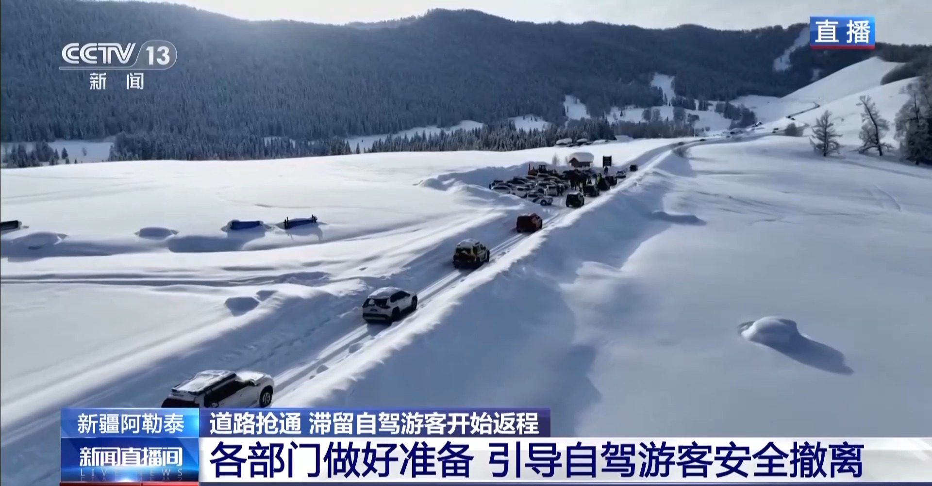 总台记者 苏蒙:目前,通往禾木村的道路,一边在通行,一边进一步拓宽。阿勒泰也出台政策,鼓励游客有序撤离。比如,这两天,村里依然为滞留游客提供免费食宿。当地交警特别提示,北京时间晚上7时左右,当地将迎来夜间时段,为了避免夜间行车发生危险,在今晚7时左右,将再次对道路进行封闭。