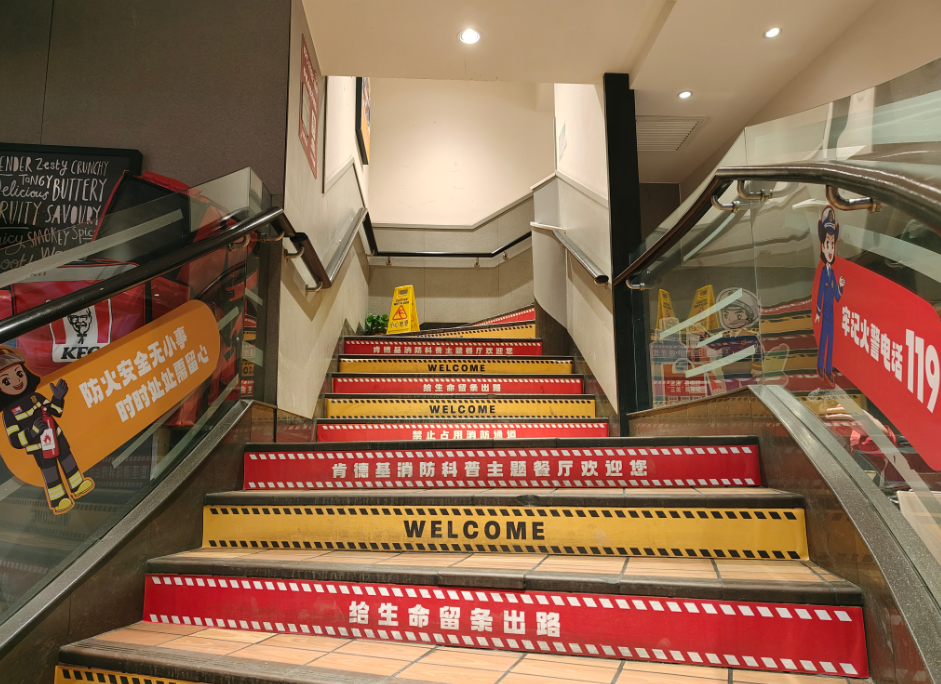 “提起灭火器,拔出保险栓,用力压手柄,扫射火焰根。”肯德基(金融街餐厅)位于金城坊街,在装修布置上以消防科普主题元素为主,将消防标识认知、消防器材认知、火场逃生口诀、灭火器的正确使用方法等搭配卡通形象,在餐厅内分区展示。