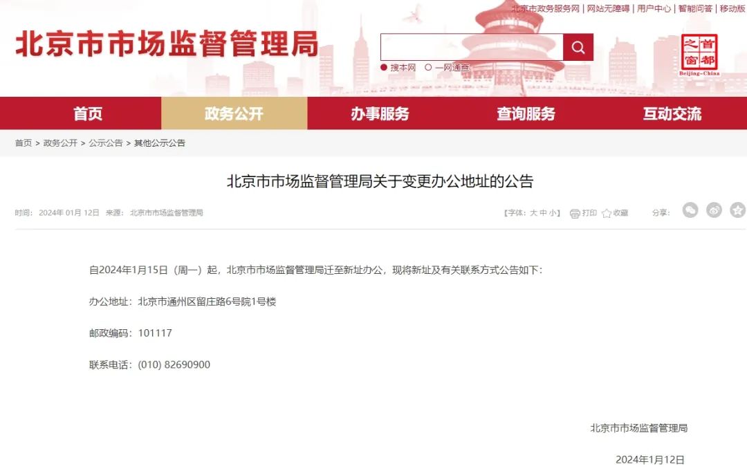 近日,北京市市场监督管理局发布关于变更办公地址的公告。根据公告,自2024年1月15日(周一)起,北京市市场监督管理局迁至新址办公。