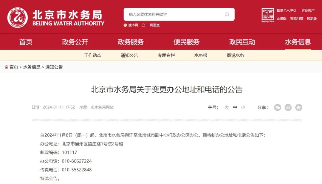 近日,北京市水务局发布关于变更办公地址和电话的公告。根据公告,自2024年1月8日(周一)起,北京市水务局搬迁至北京城市副中心行政办公区办公。