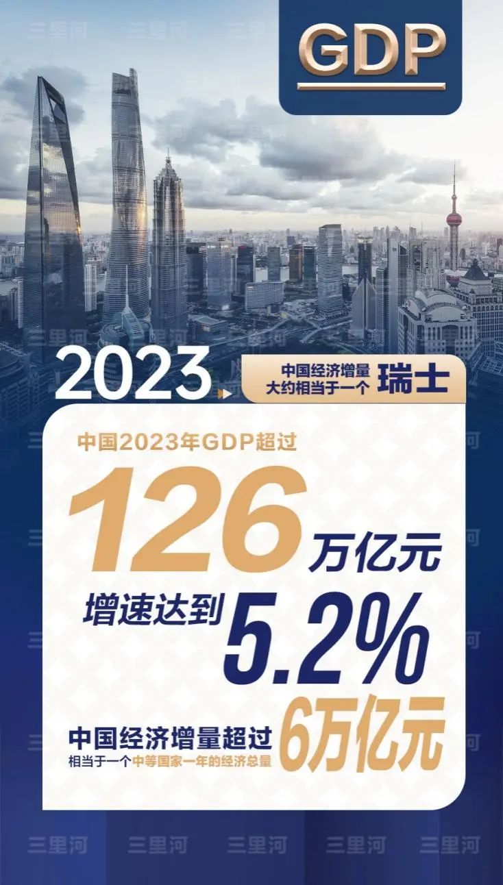 2023年中国经济年报显示,全年GDP超过126万亿元(人民币,下同),增速达到5.2%。按照可比价计算,2023年中国经济增量超过6万亿元,相当于一个中等国家一年的经济总量。