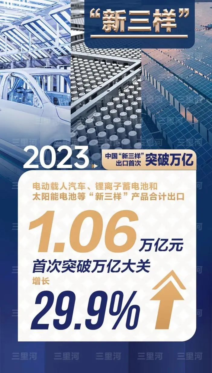 活力来自新动能——制造业技改投资增长3.8%,高技术产业投资增长10.3%,快于全部固定资产投资的增速。2023年电动载人汽车、锂电池和太阳能电池等“新三样”产品合计出口1.06万亿元,首次突破万亿大关。中国经济在加快培育新质生产力中不断发展壮大。