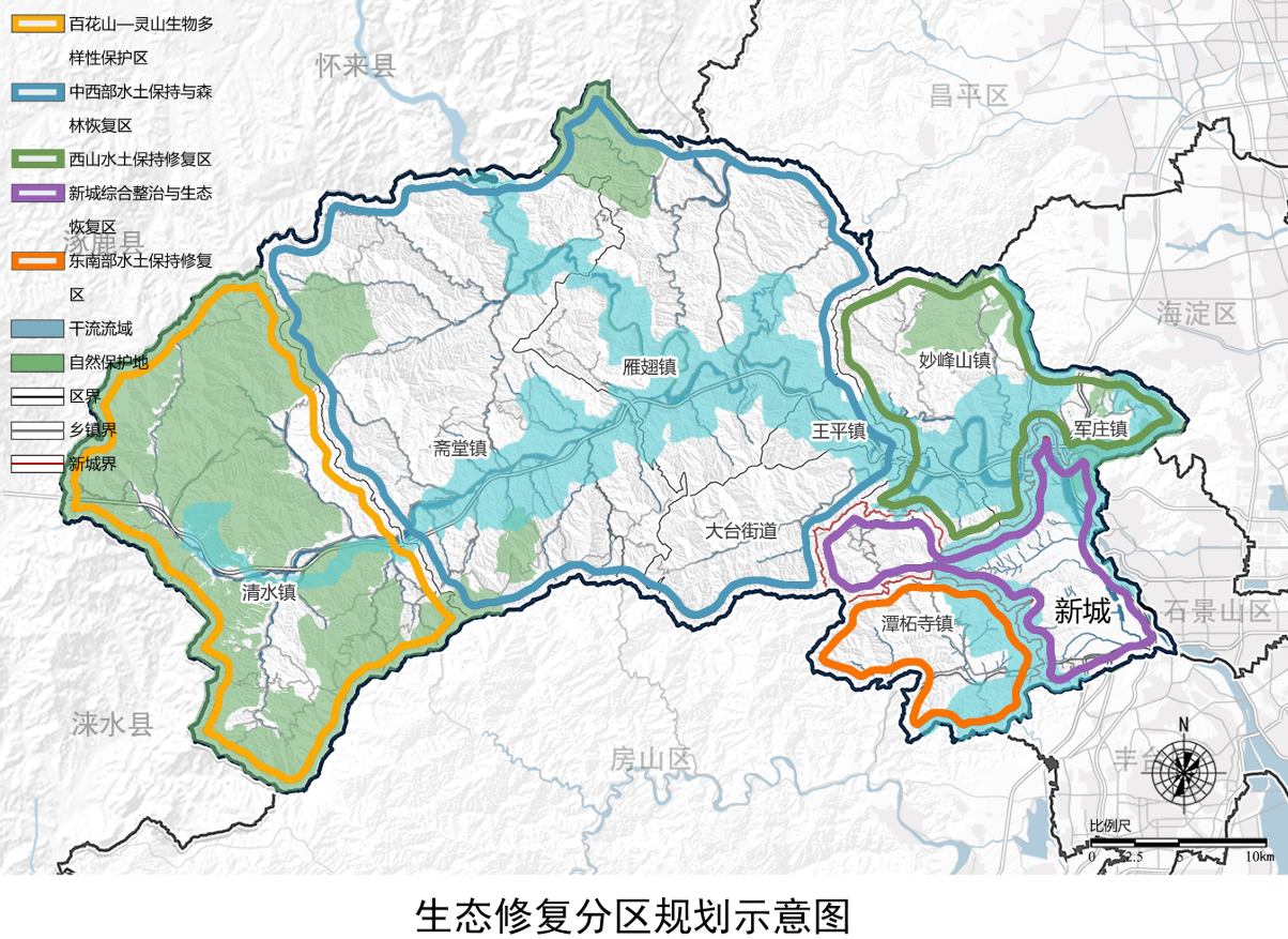 针对全区未来防洪、抗灾需求,《规划》中提出,构建“西排东挡、环山截流、疏蓄联动”的防洪格局:“西排”是指西部山区以保障镇村防洪安全为主要任务,结合水库、塘坝、小流域治理,消能减势,蓄排结合,以排为主。“东挡”是指通过永定河右堤拦挡永定河过境洪水,保障新城防洪安全。“环山截流”即在环山建设区外围修建截洪沟截导坡面洪水,分段入河,消减坡面洪水威胁,保障环山建设区防洪安全。“疏蓄联动”即河道疏挖治理与蓄滞洪措施有机结合,实现区域防洪安全。