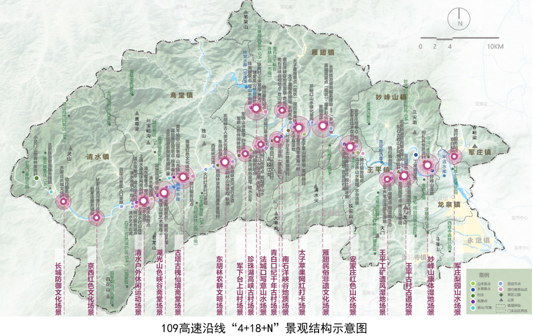 根据《规划》,门头沟区将以109国道沿线和永定河文化带作为带动山区文旅产业融合发展的经济引擎,构建“山、水、村、驿”4类景观系统、18大山水人文场景、78个特色景观节点,形成“新城—妙峰山段”“王平镇段”“雁翅镇段”“斋堂镇段”“清水镇段”等五段特色景观,将109国道沿线风貌打造成为让人“慢下来、静下来、爱起来”的全域风景道和京西生态文明窗口。