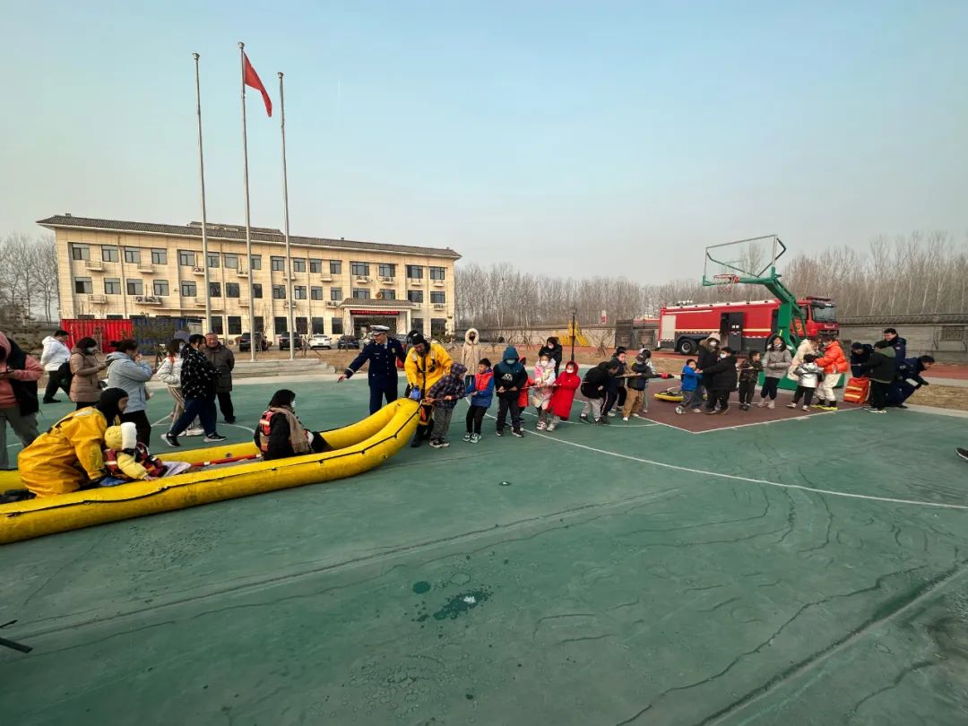 在室外操场,消防员们已将冰面救援体验项目搭建齐全,消防讲解员向师生们介绍了冰面救援船及冰面专业作业服等消防器材的作用和使用方法,同学们听完对体验项目的介绍后,在消防员的帮助下,一名家长和孩子穿戴好水域救援专业救生衣,体验了一把“被困冰面”的感受,被水域专业救援队成功打捞上岸。体验结束后,大家纷纷表示,每个项目都很真实,能够使人身临其境,明白了生活中发生此类事故后应该如何救人和自救,此次“冰面救援”科目,是通州区首次将该项目纳入消防培训教育中。活动最后,现场利用“油锅起火”实验,与学生们一问一答,形式生动有趣,现场气氛轻松活跃,极大限度地激发同学们学习消防知识的热情,收到良好的宣传教育效果。