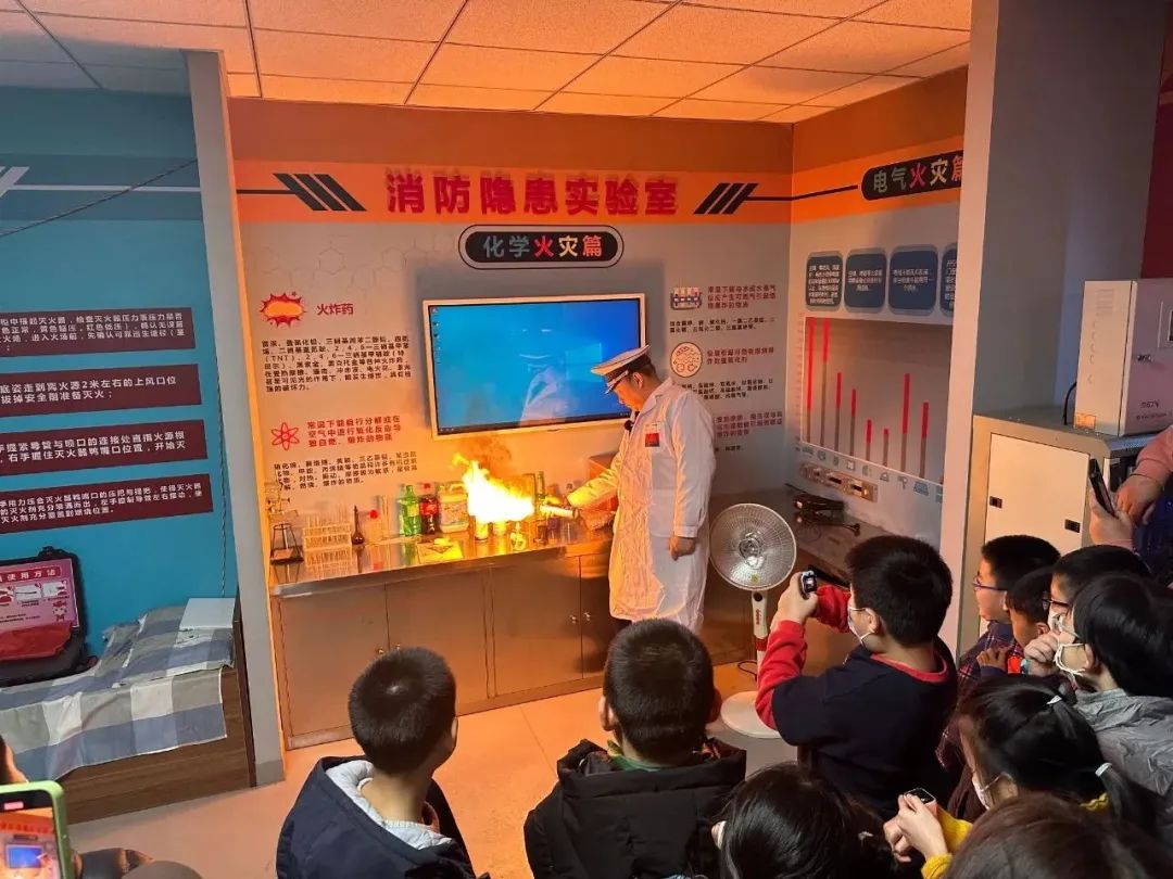 “同学们知道这是什么吗?”“它的功能和原理是什么?”“是靠烟感来报警的。”“不对,那个是靠温度来感应报警的。”“你们还知道哪些呢?”…… 在消防科普体验馆内,一件件新奇而特别的消防装备引起了学生们浓厚的学习兴趣,消防员在现场进行了杀虫剂、花露水、消毒喷雾剂等家常用品“明火”消防实验,并通过现场提问和抢答的方式增强学生对理论知识的理解。