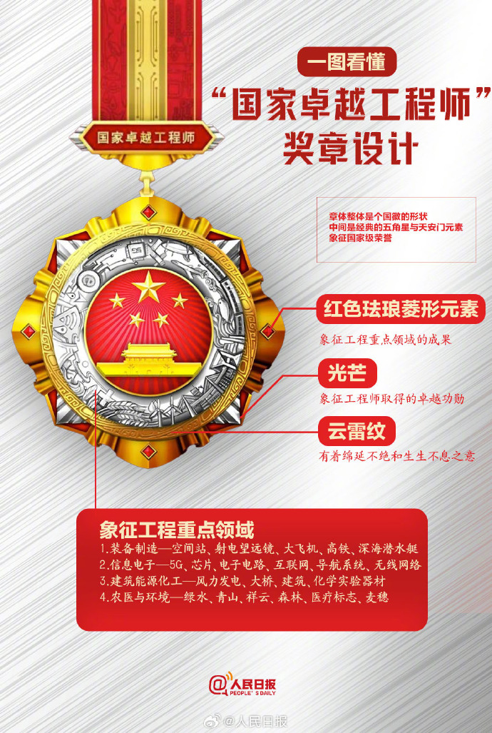 今天,“国家卓越工程师”奖章亮相。这是我国工程师领域的最高荣誉勋章。奖章选取的元素包括高铁、5G、港珠澳大桥、杂交水稻等我国具有代表性的工程技术成果。一图看懂国家卓越工程师奖章中的彩蛋↓↓收藏,向广大工程技术人员致敬!