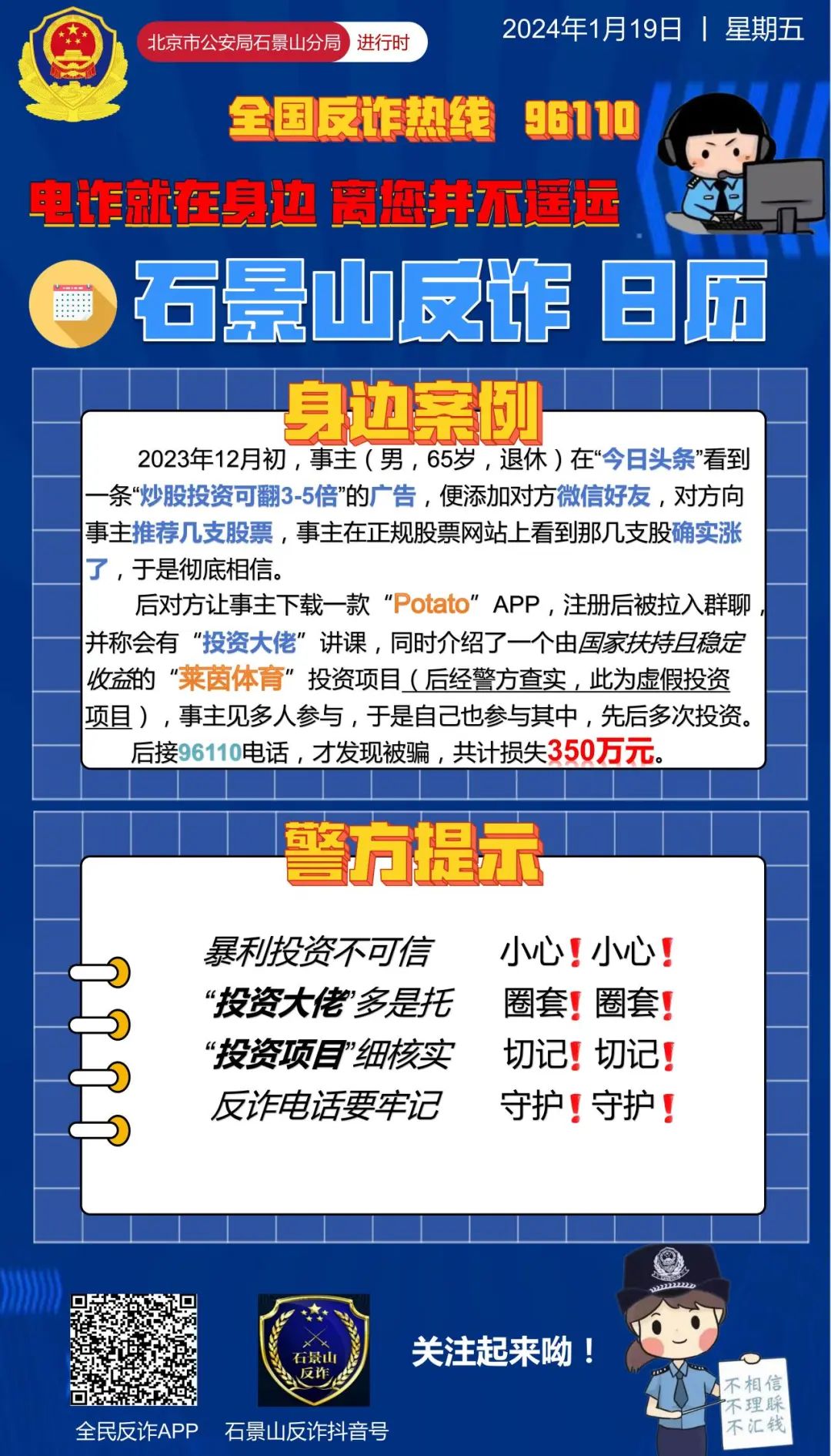 后对方让事主下载一款“Potato”APP,注册后被拉入群聊并称会有“投资大佬”讲课,同时介绍了一个由国家扶持且稳定收益的“莱茵体育”投资项目(后经警方查实,此为虚假投资项目),事主见多人参与,于是自己也参与其中,先后多次投资。后接到反电信网络诈骗专用号码96110,才发现被骗,共计损失350万元。