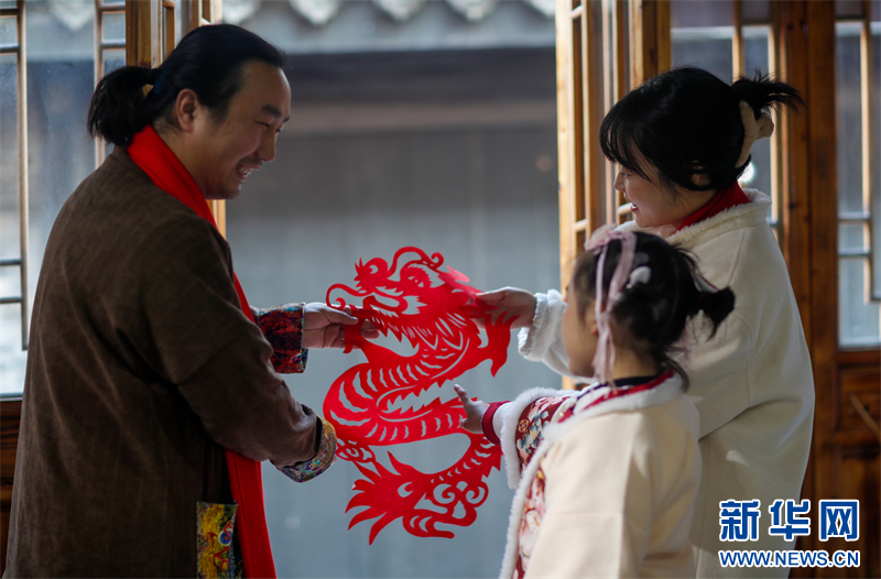 在江苏省兴化市昭阳街道北门街区,民间剪纸艺人给小朋友们传授非遗剪纸知识、展示剪纸技艺,喜迎龙年。