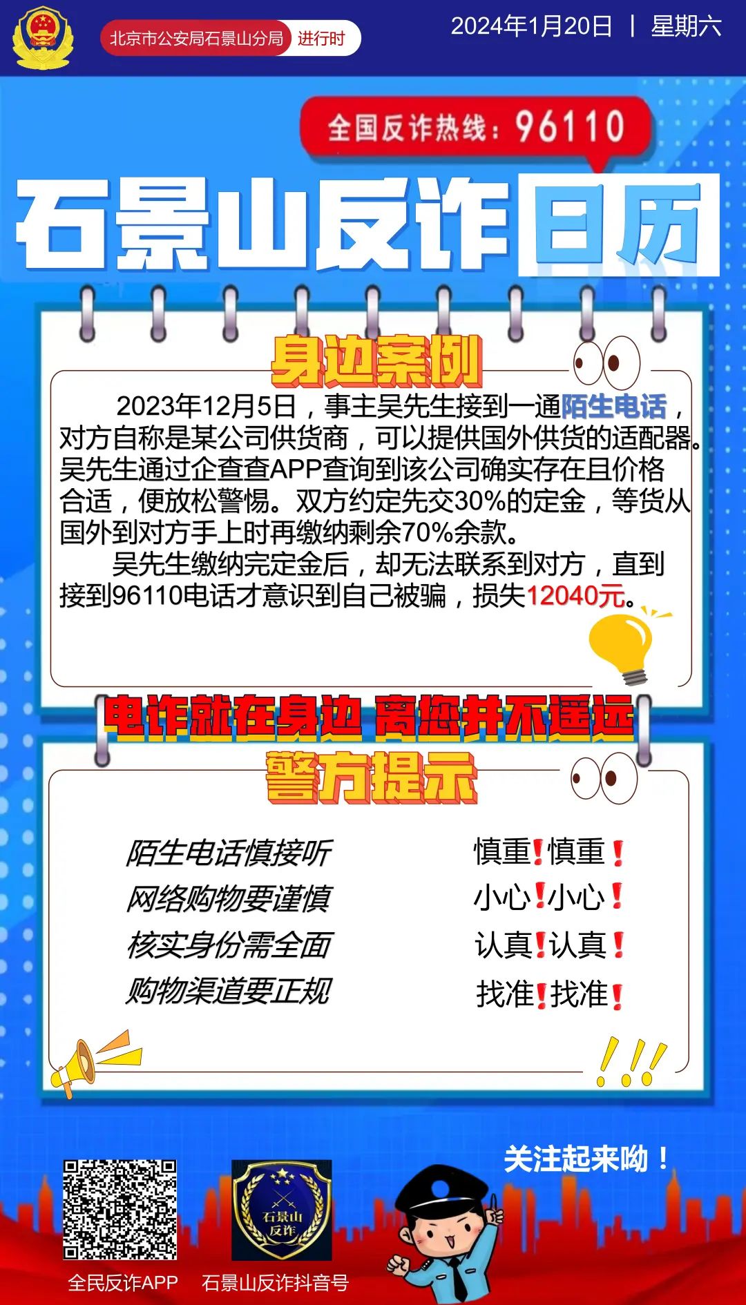 吴先生缴纳完定金后,却无法联系到对方,直到接到96110电话才意识到自己被骗,损失12040元。