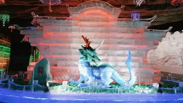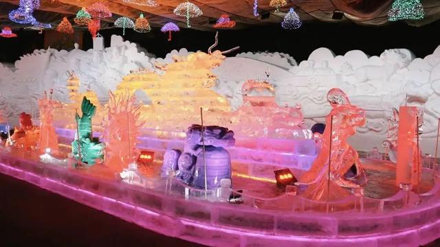 最不能错过的当属雪雕艺术区的百米雪雕——《龙王行雨图》。作品展现了龙王降雨的全过程,龙头高昂挺拔、龙身粗壮健硕、龙爪苍劲有力、龙尾灵动跳脱,整体刻画生动形象,表达了对龙年风调雨顺的祈愿。