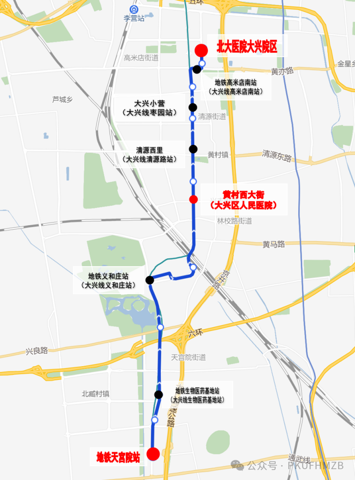 地铁天宫院站、天宫院小区、地铁生物医药基地站、盛源桥北、地铁义和庄站、义和庄东里、黄村西大街(大兴区人民医院)、化纤俱乐部、清源西里、兴华园、大兴小营、洪村、地铁高米店南站、缤纷城、北大医院大兴院区