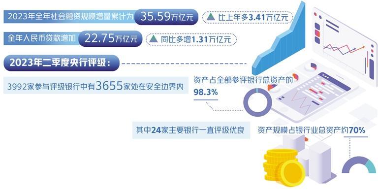 金融安全是国家安全的重要组成部分,当前我国金融体系总体稳健。从2023年第二季度中国人民银行金融机构评级结果看,3992家参与评级银行中有3655家处在安全边界内,资产占全部参评银行总资产的98.3%,其中24家主要银行一直评级优良,资产规模占银行业总资产约70%,是我国金融体系的“压舱石”。