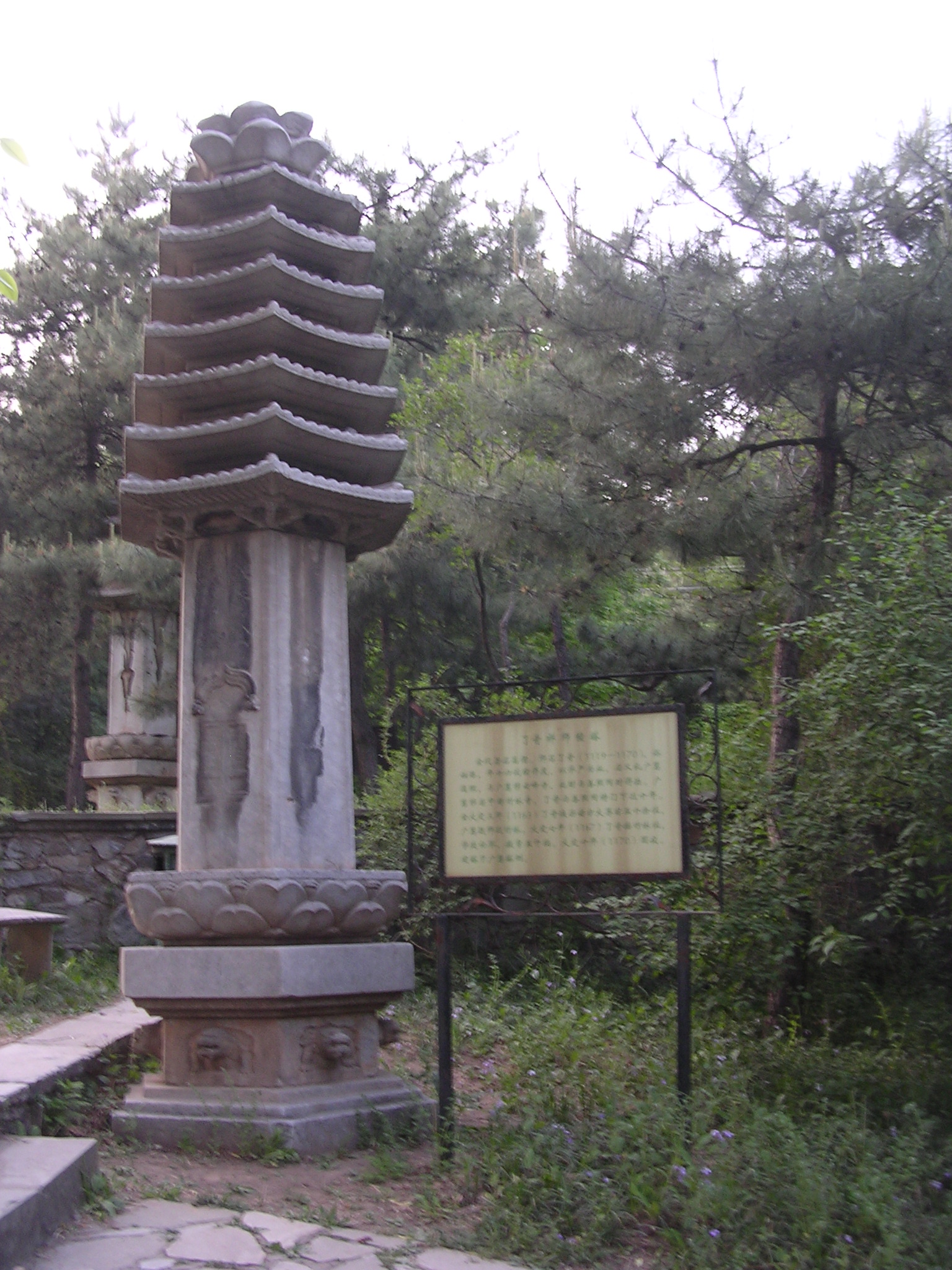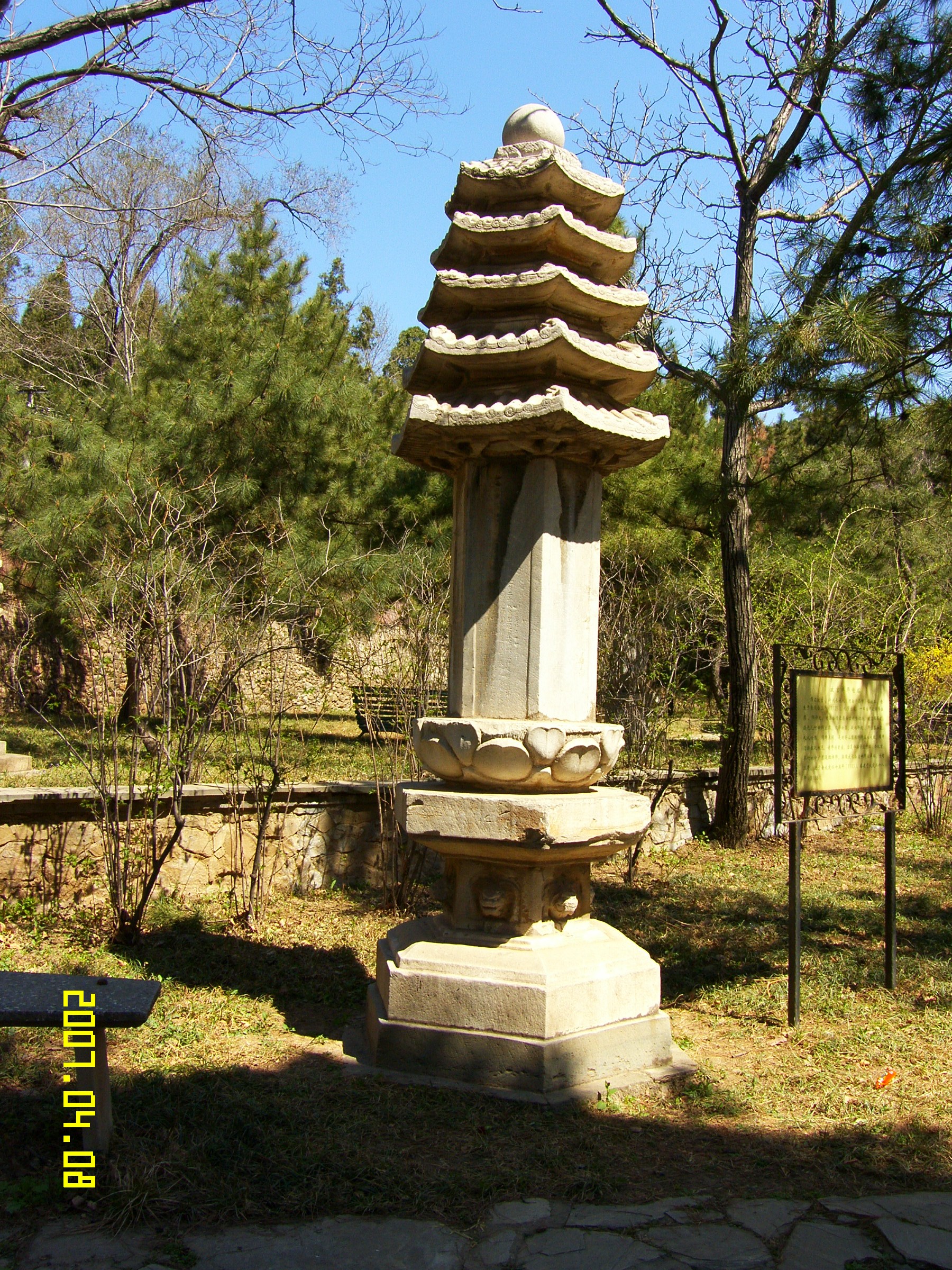 金代了奇大师七级浮屠石经幢塔,是潭柘寺现存最早的碑刻,建于金大定十九年,至今已经800余年。该塔为六角七级汉白玉幢塔,分为塔基、塔身和塔顶三部分。全高4.5米,幢高1.38米。它用材讲究,造型优美,比例匀称。