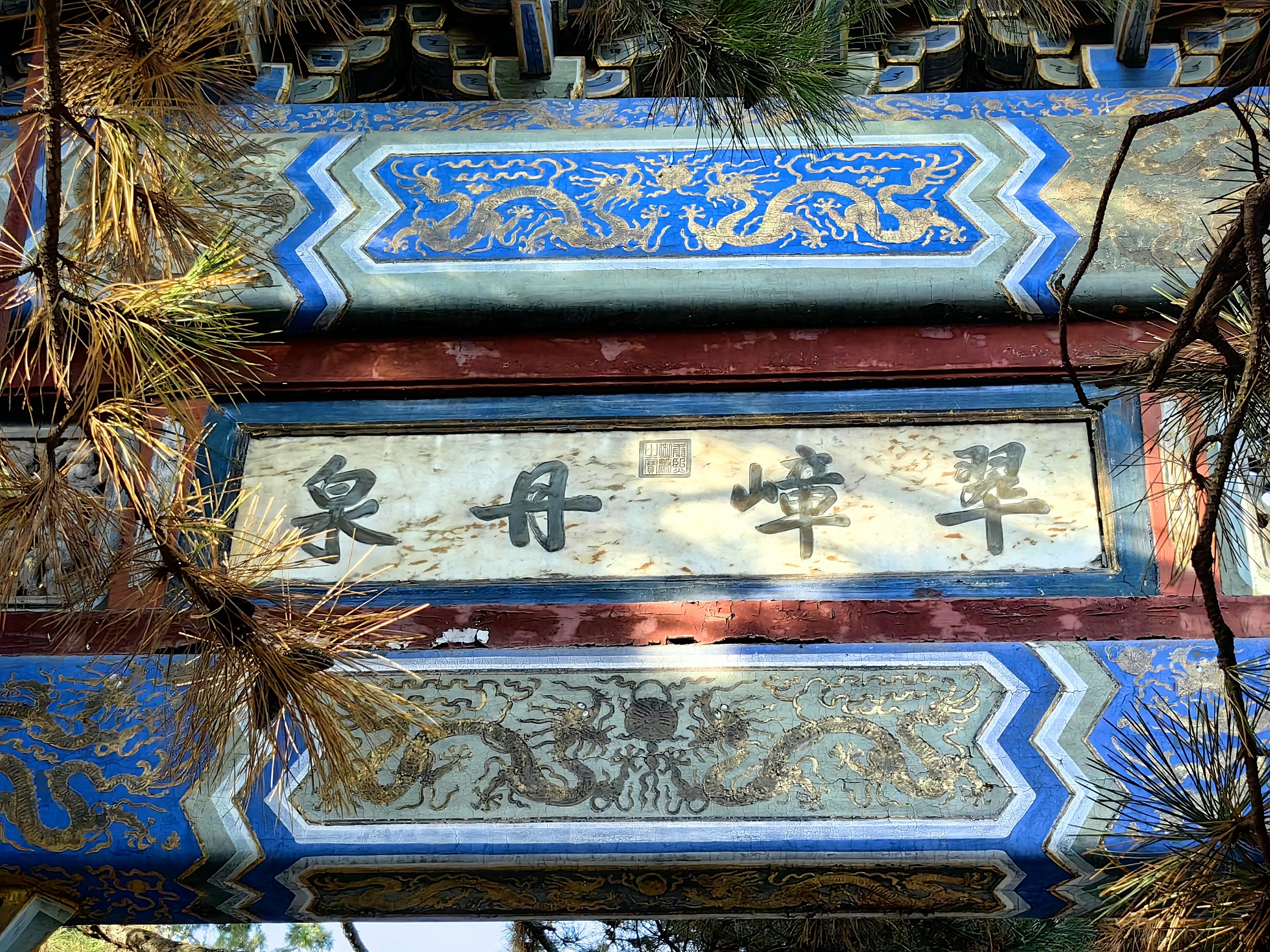 “翠嶂丹泉”这块匾额告诉人们:潭柘寺好山好水,其造化远超北京的“苦海幽州”,而其庙宇的建设也早于北京城的宫殿。或许“先有潭柘寺,后有北京城”的说法由此而来。