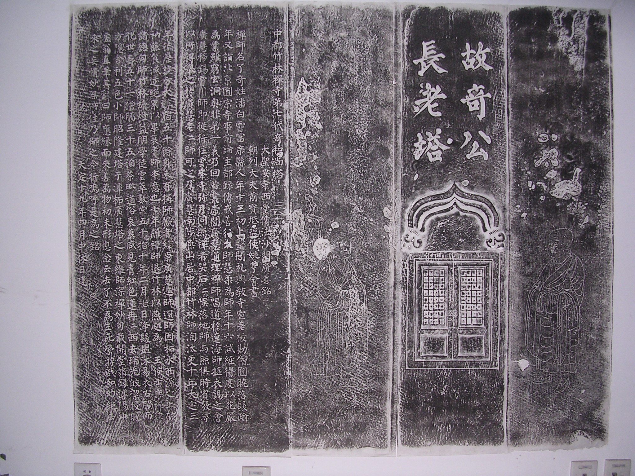 塔身的第一面为题额:“故奇公长老塔”,第二面和第六面为白描僧尼像,为后人留下了当年高僧的形象。第三、四面则刻有铭文,首题“中都竹禅寺第七代奇和尚塔”,碑文清晰可辨,书法宗颜体,端庄遒劲,讲述的是了奇大师的生平。