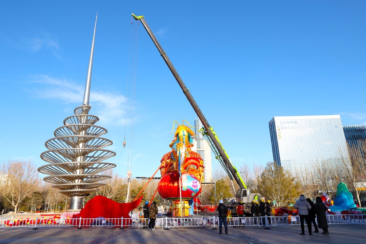 △博大公园大型“龙年彩灯”正在吊装。吴江/摄