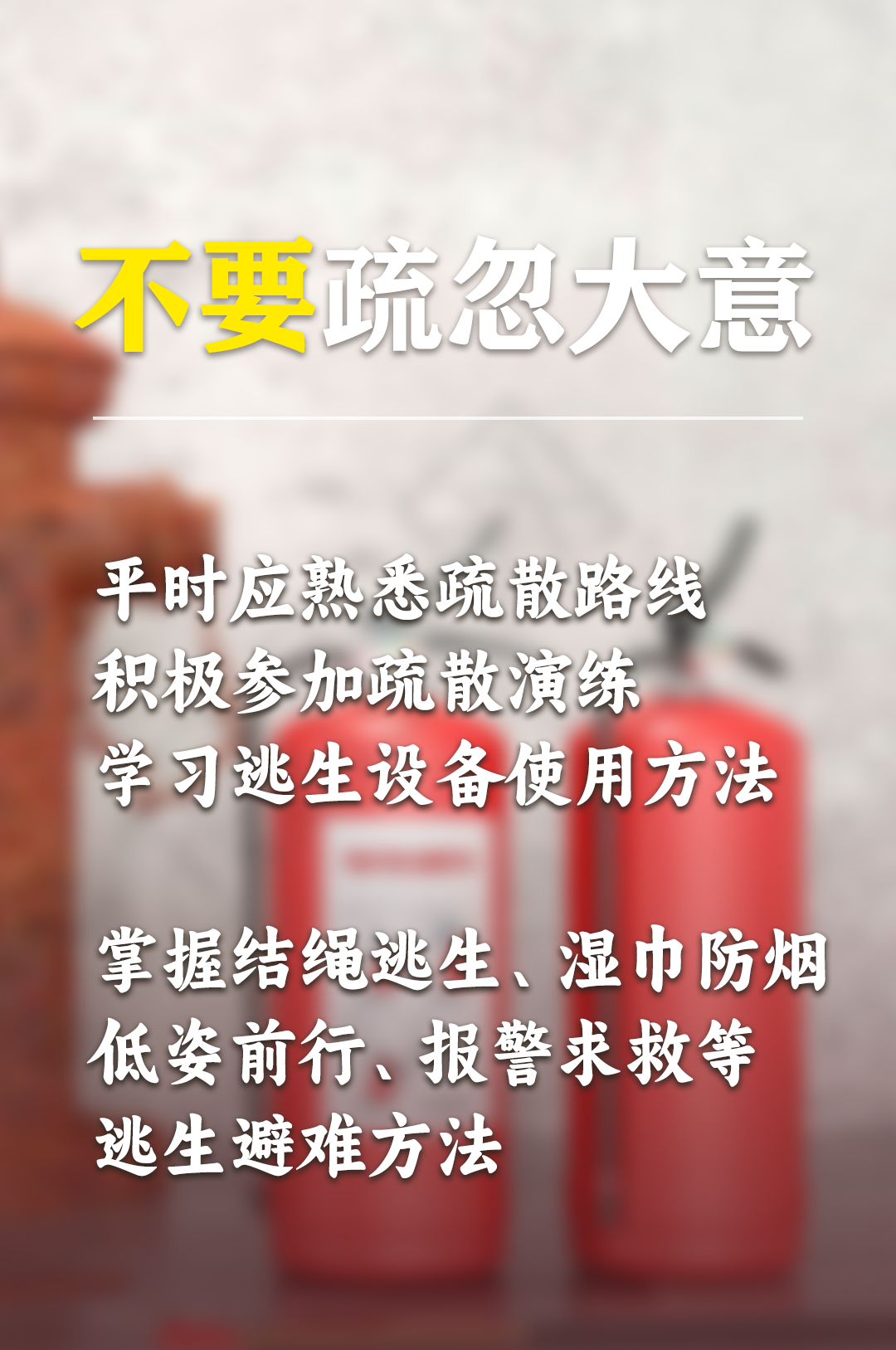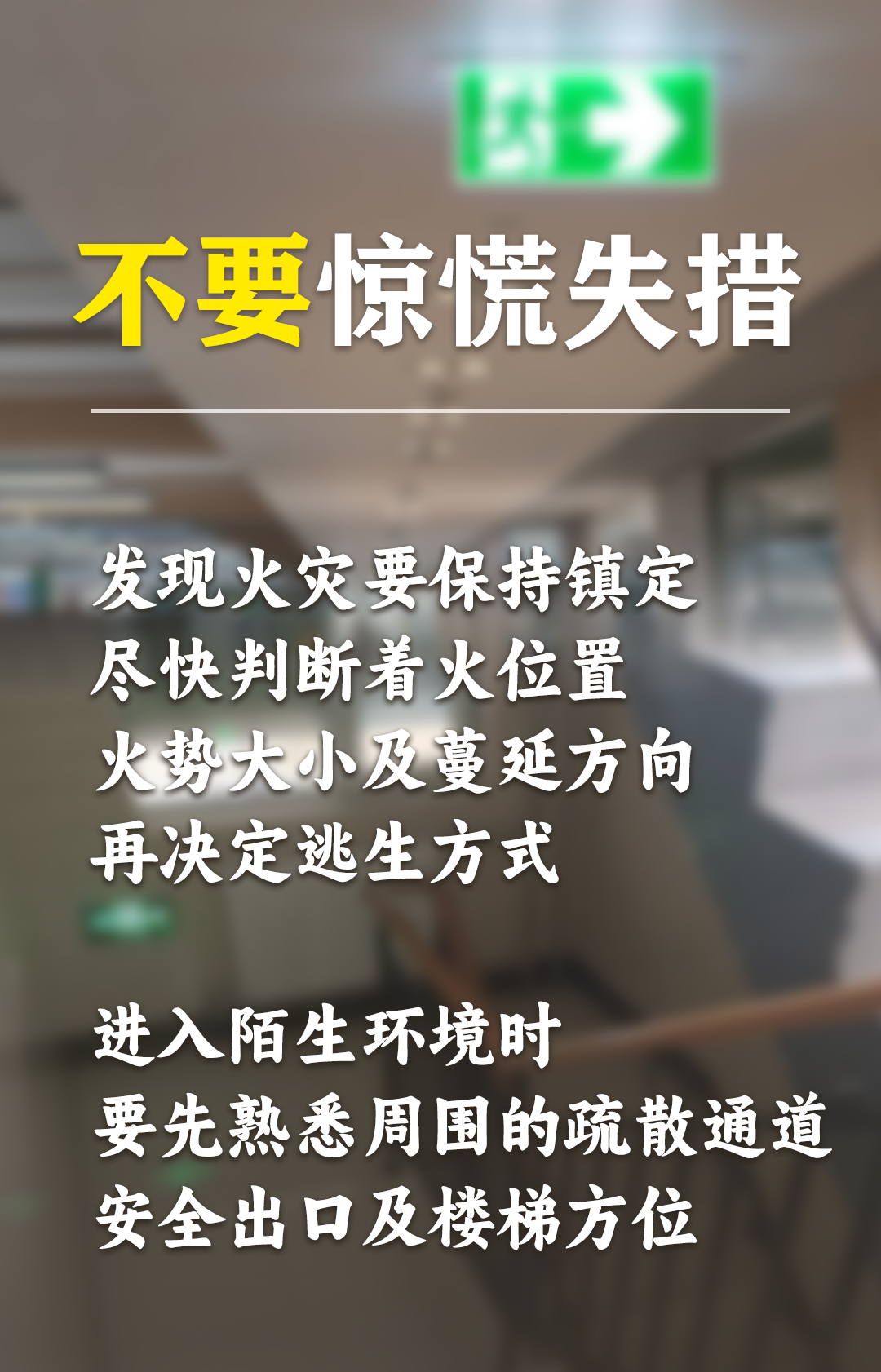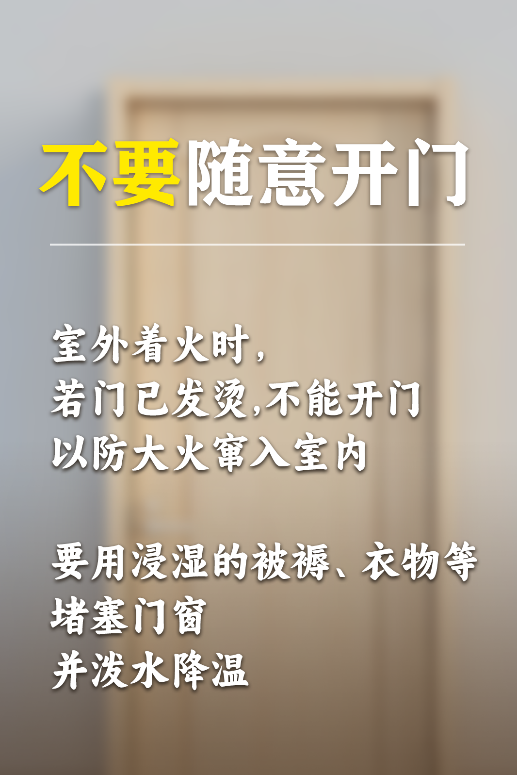 遇到火灾第一时间拨打119报警。如在公众聚集场所遇到火灾时,应根据工作人员引导疏散,不要盲目跟风,相互拥挤,以免发生挤压踩踏事故;必须穿过浓烟逃生时,尽量用浸湿的衣物保护头部和身体,捂住口鼻,弯腰低姿前行。