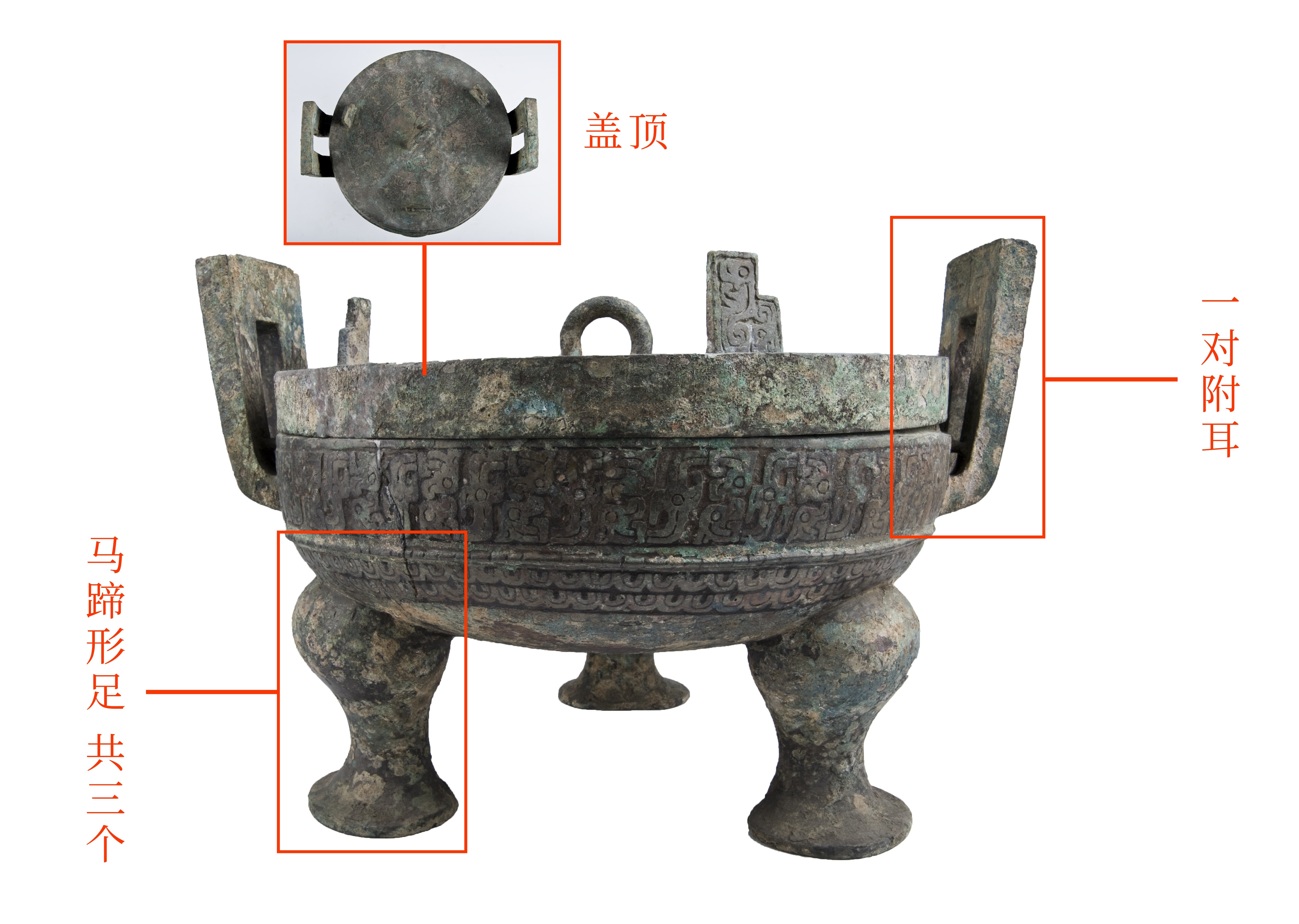 附耳直立、马蹄形足、有盖、平顶