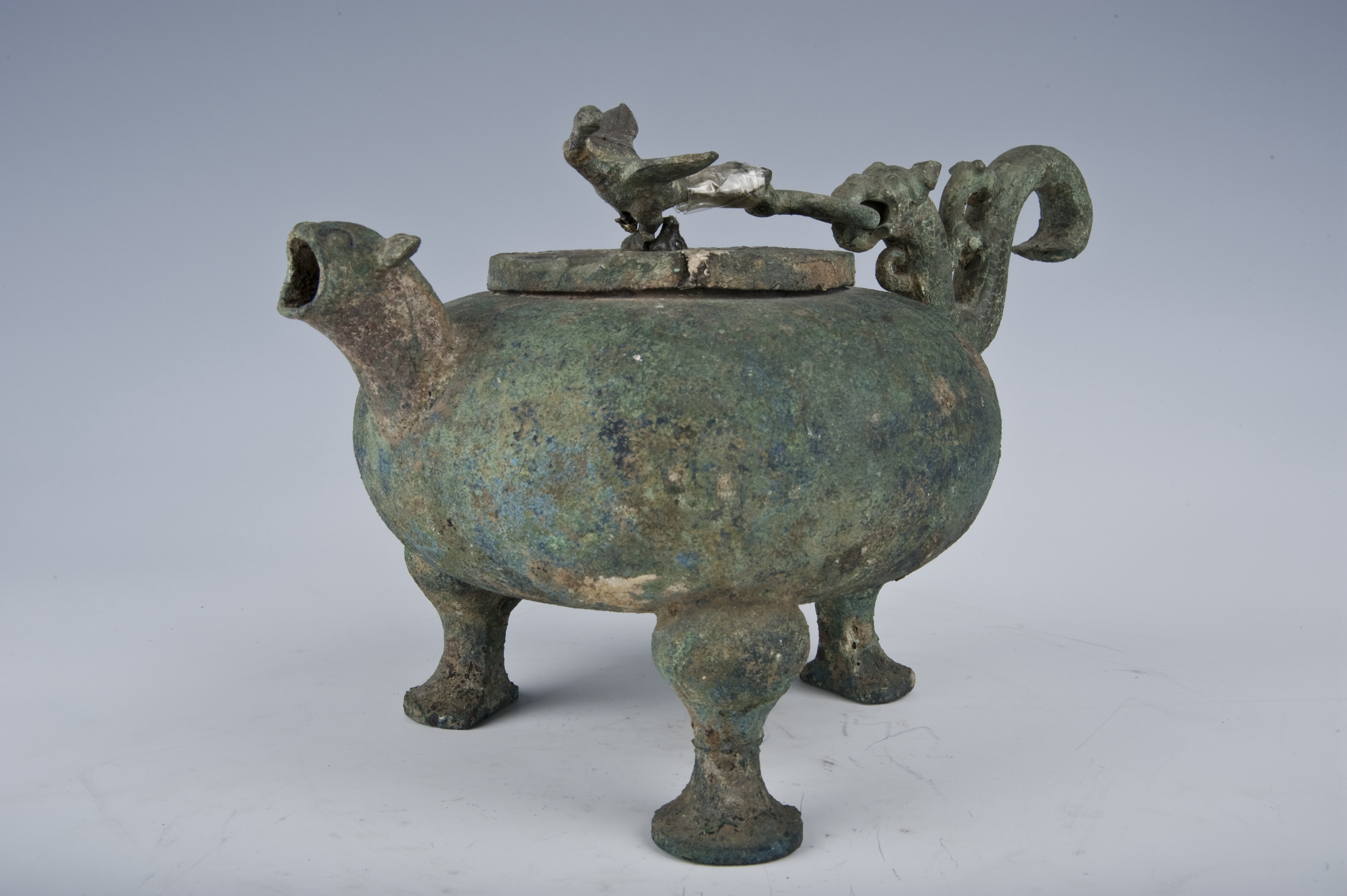 △春秋龙形鋬(pàn)兽首蹄足圆形盖鸟形钮青铜盉(hé)