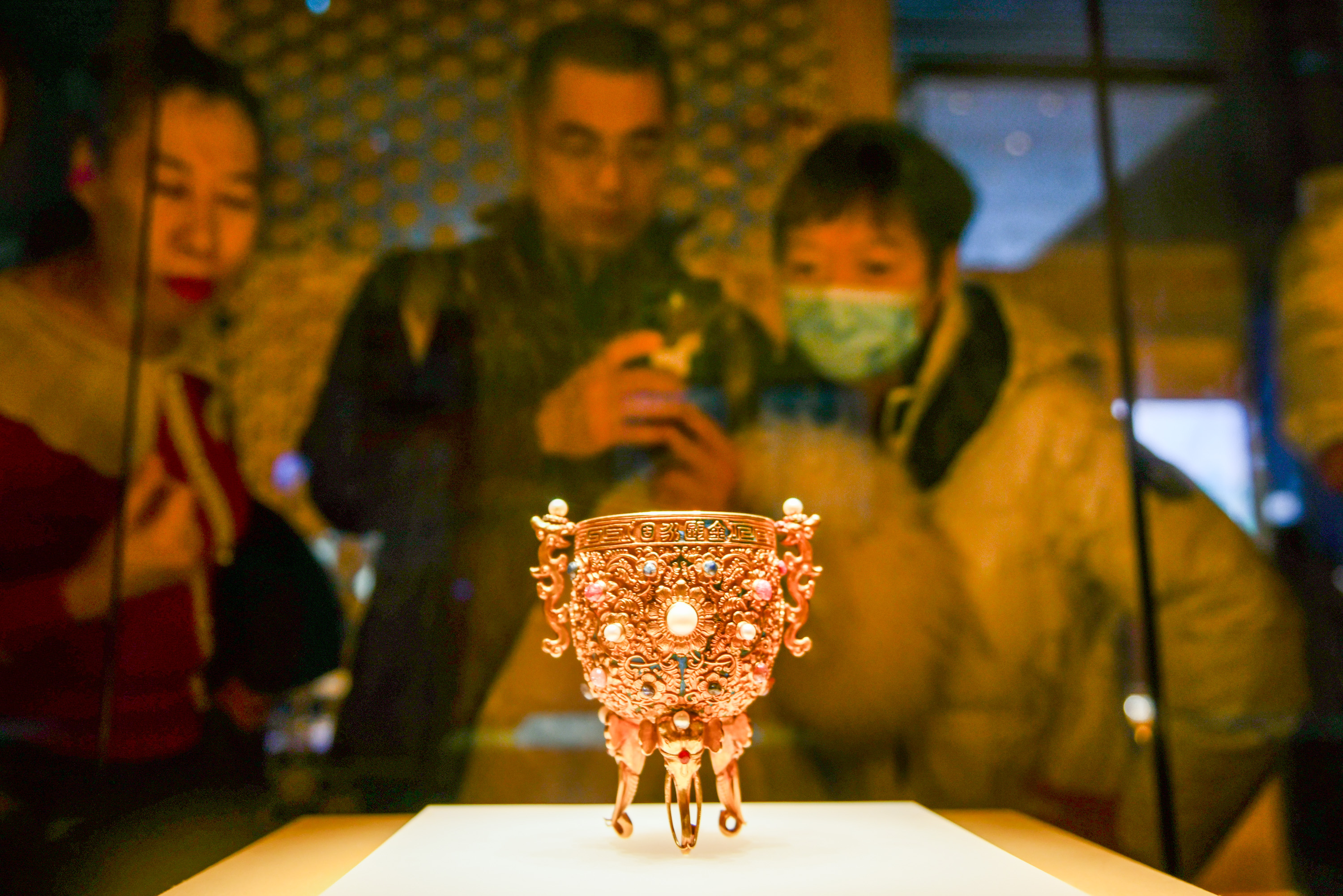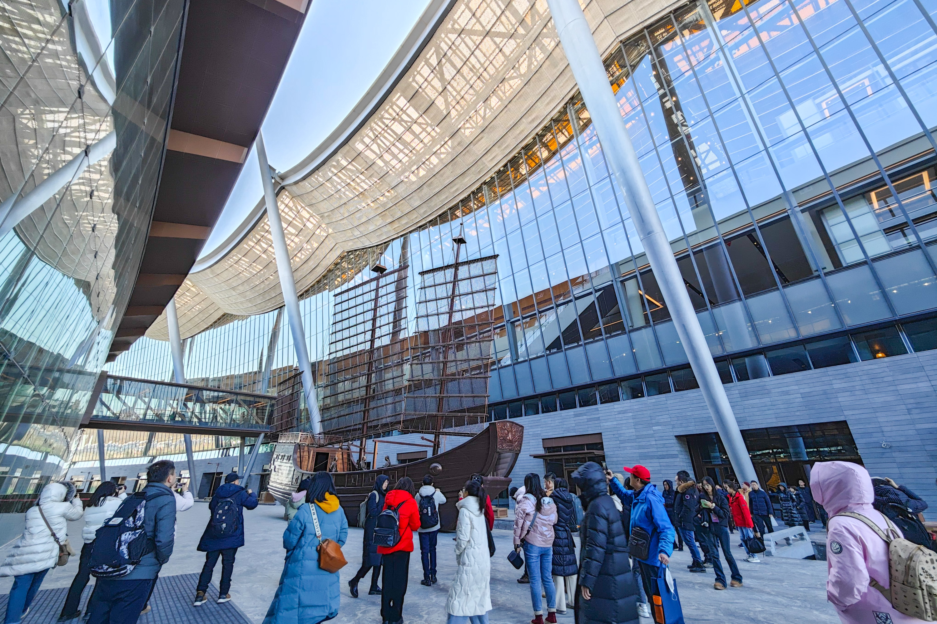 昨天中午,北京大运河博物馆内人头攒动。三艘真船大小的铜船跟前不断有市民和游客拍照留念,表达人们对“运河之舟”的喜爱。明万历皇帝的金翼善冠、清乾隆帝每逢新年时使用的金瓯永固杯等珍贵展品跟前,围着里三层外三层的参观者。“不止运河——沉浸式体验展”用时12分钟,带领观众从漕运鼎盛时期的通州出发,游遍运河沿岸十余城市,再回到当代的北京城市副中心,体验古今融合的奇妙之旅。
