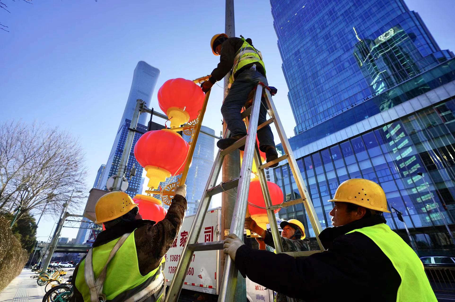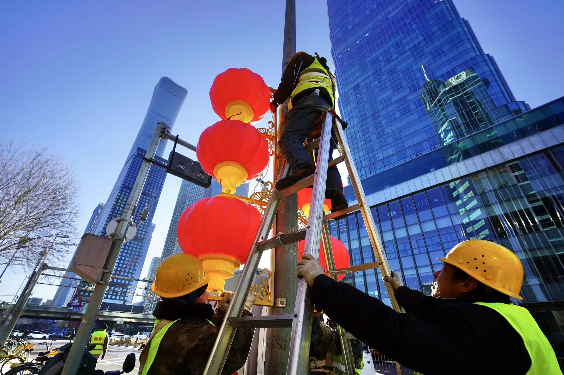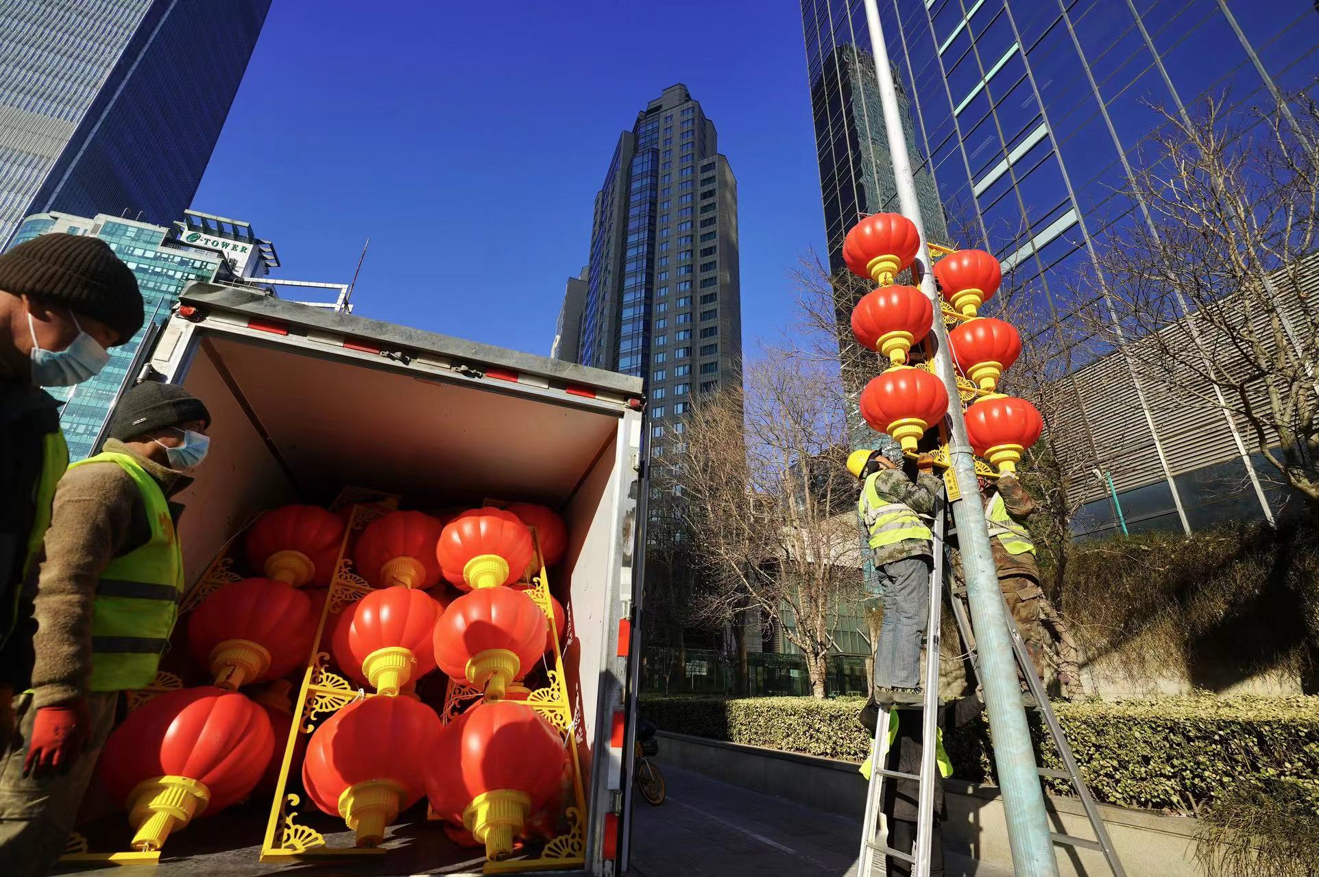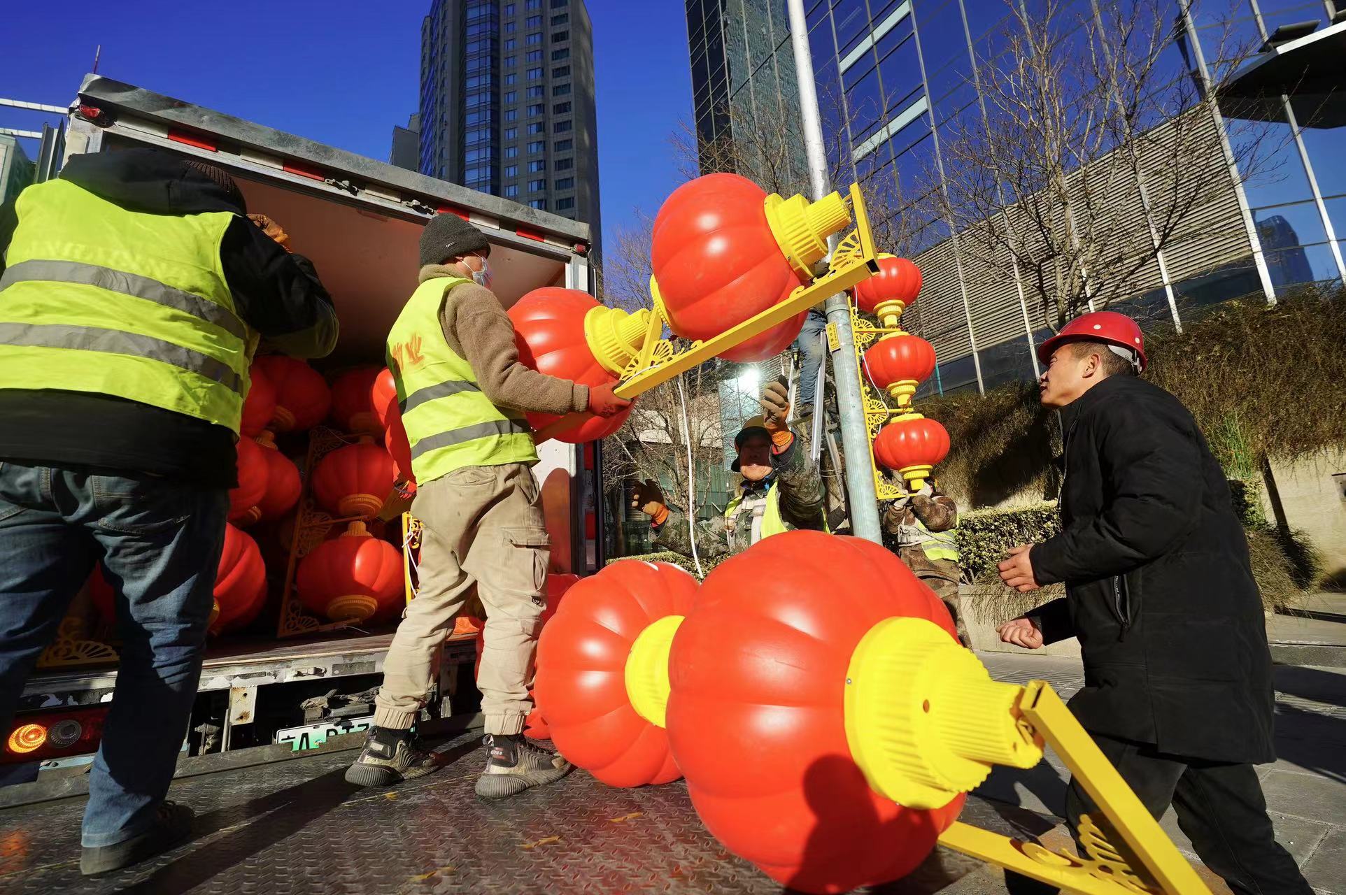2024年春节悄然临近,朝阳区城管委施工人员抓紧时间悬挂大红灯笼、布置景观,让人们感受到日渐浓厚的年味。