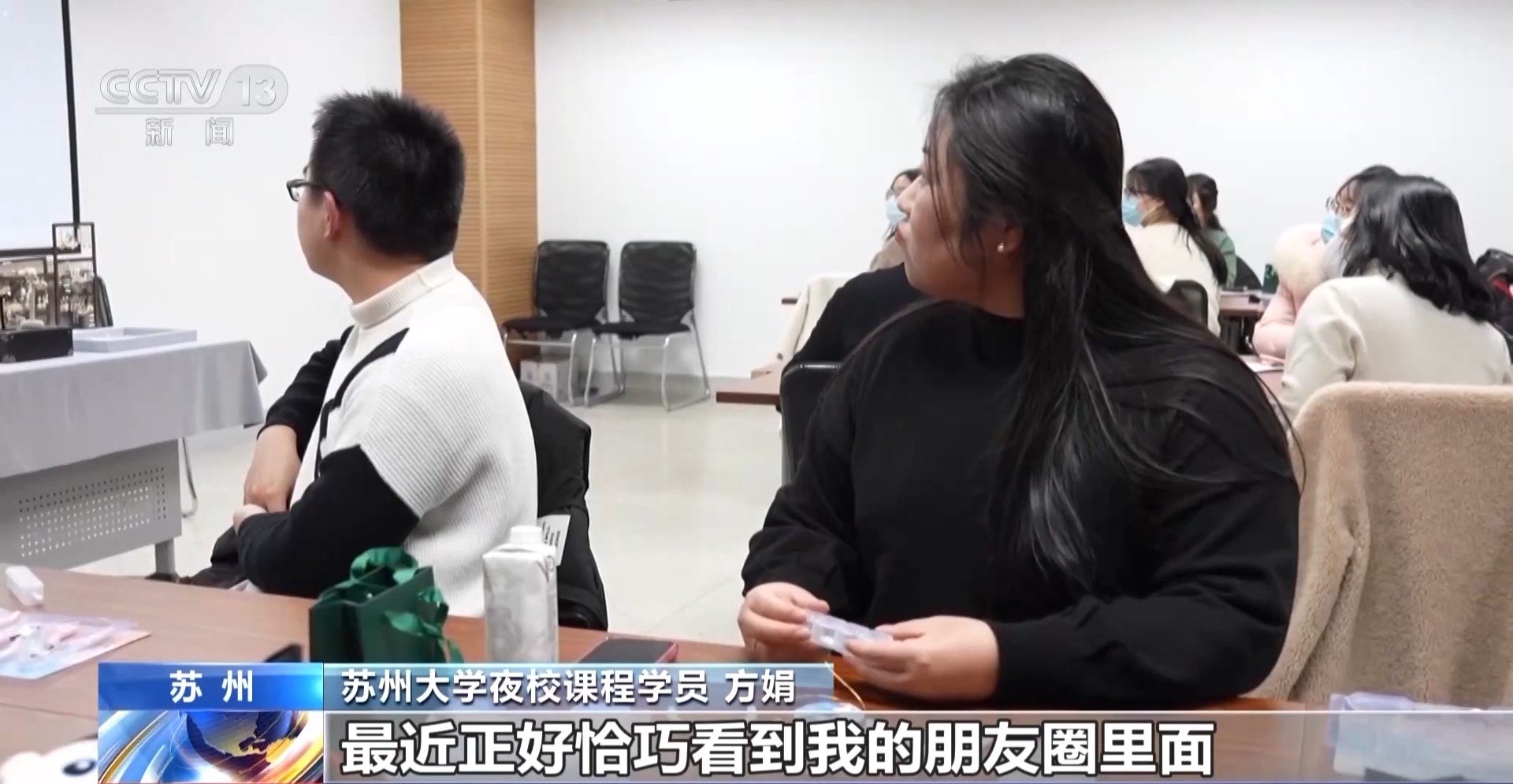 苏州大学夜校课程学员 方娟:我是从上海浦东赶过来的,最近正好看到朋友圈里面有这样一条信息,说苏州大学开办了夜校活动,我就第一时间参加了。我报的是首饰饰品的制作课程。