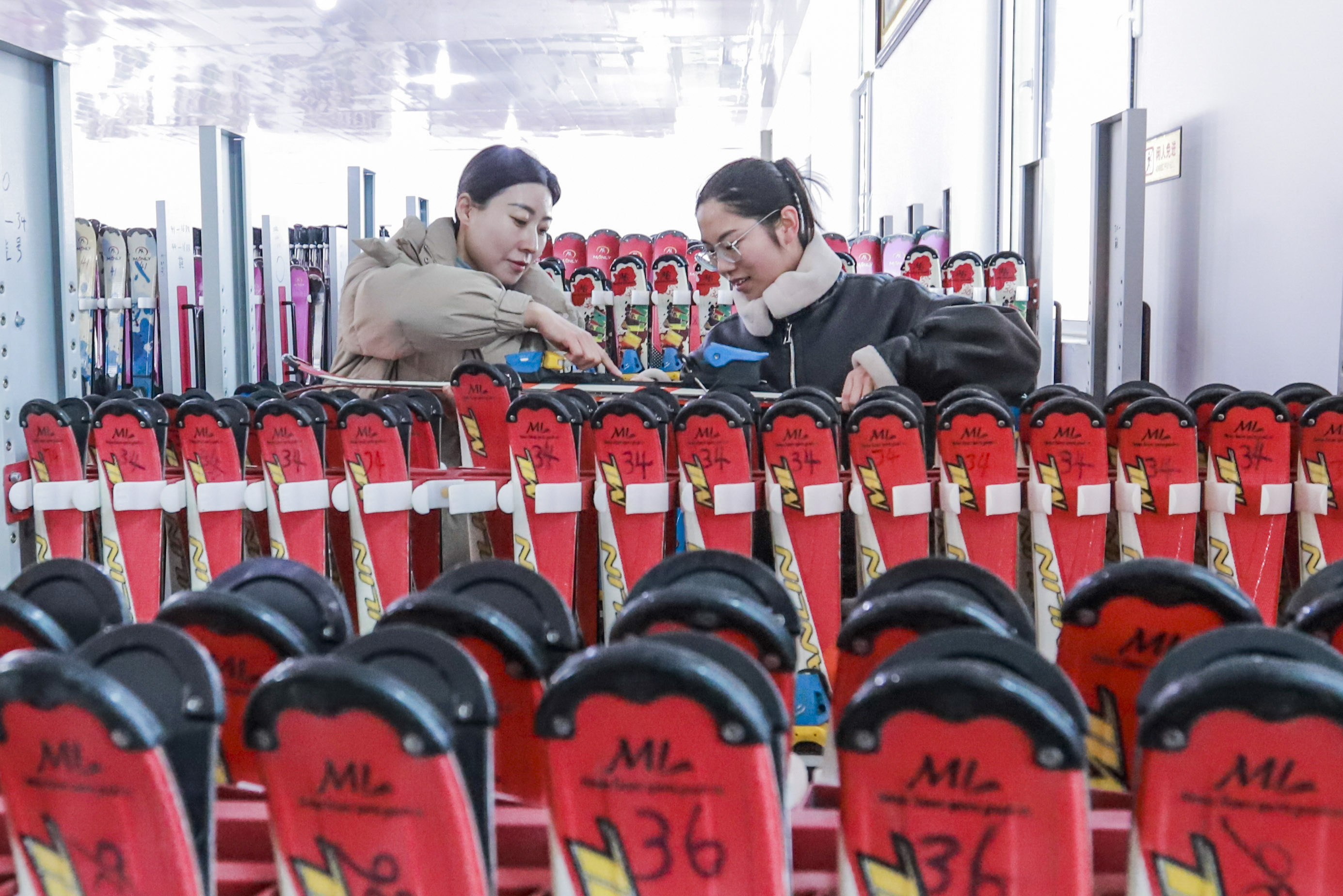 2023年12月28日,游客在河北省承德市兴隆县一处滑雪场挑选雪板。新华社发(刘满仓摄)