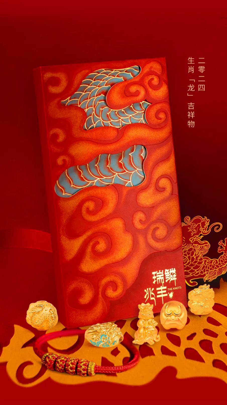 “结绳记”推出瑞鳞兆丰和青龙出渊两款本命绳。“老银匠”推出国粹簪刻·大师手作之礼——双龙护主,五福吉祥手镯。国潮老字号北京金漆镶嵌推出瑞龙转运珠手链系列和瑞龙漆珠胸针系列首饰。北京龙在天皮影艺术剧院推出了皮影戏考古盲盒。和香制作技艺代表性传承人孙亮设计推出了法海龙云新春礼盒,将龙子香包、龙云线香、金龙香插组合,让新春家中空气更有韵味。