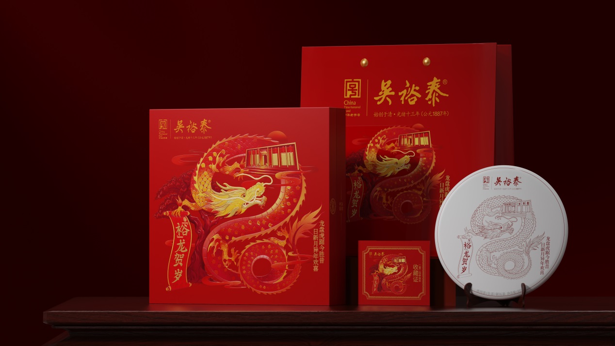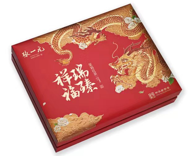 饮食文化中同样少不了龙年主题。稻香村推出了惊蛰盘龙·万象更新龙年限定糕点礼盒。灿黄的饼皮之上盘卧着一只金龙,它仿佛刚刚苏醒又蓄势待发,寓意迎接新一年的机遇与挑战。北京同仁堂健康品牌则推出了龙年•万象更新年糕礼盒。入选联合国教科文组织人类非遗名录的吴裕泰和张一元制茶技艺,也纷纷推出了龙主题茶叶礼盒。