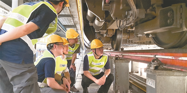 复兴号高速列车研发创新团队负责人周黎正与同事们查看列车试验后转向架的状态。