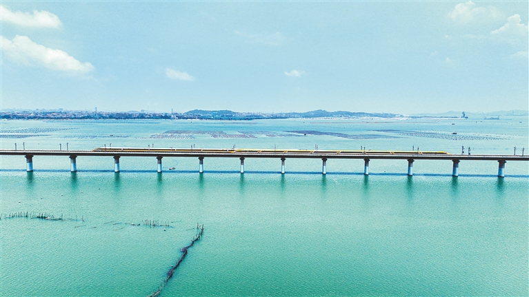 CR450试验列车正在湄洲湾跨海大桥进行交会试验。