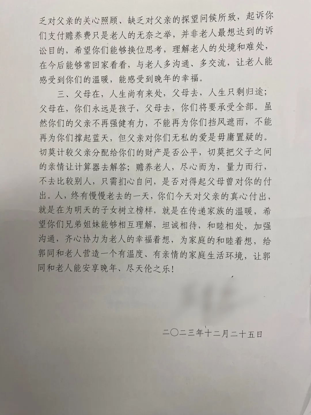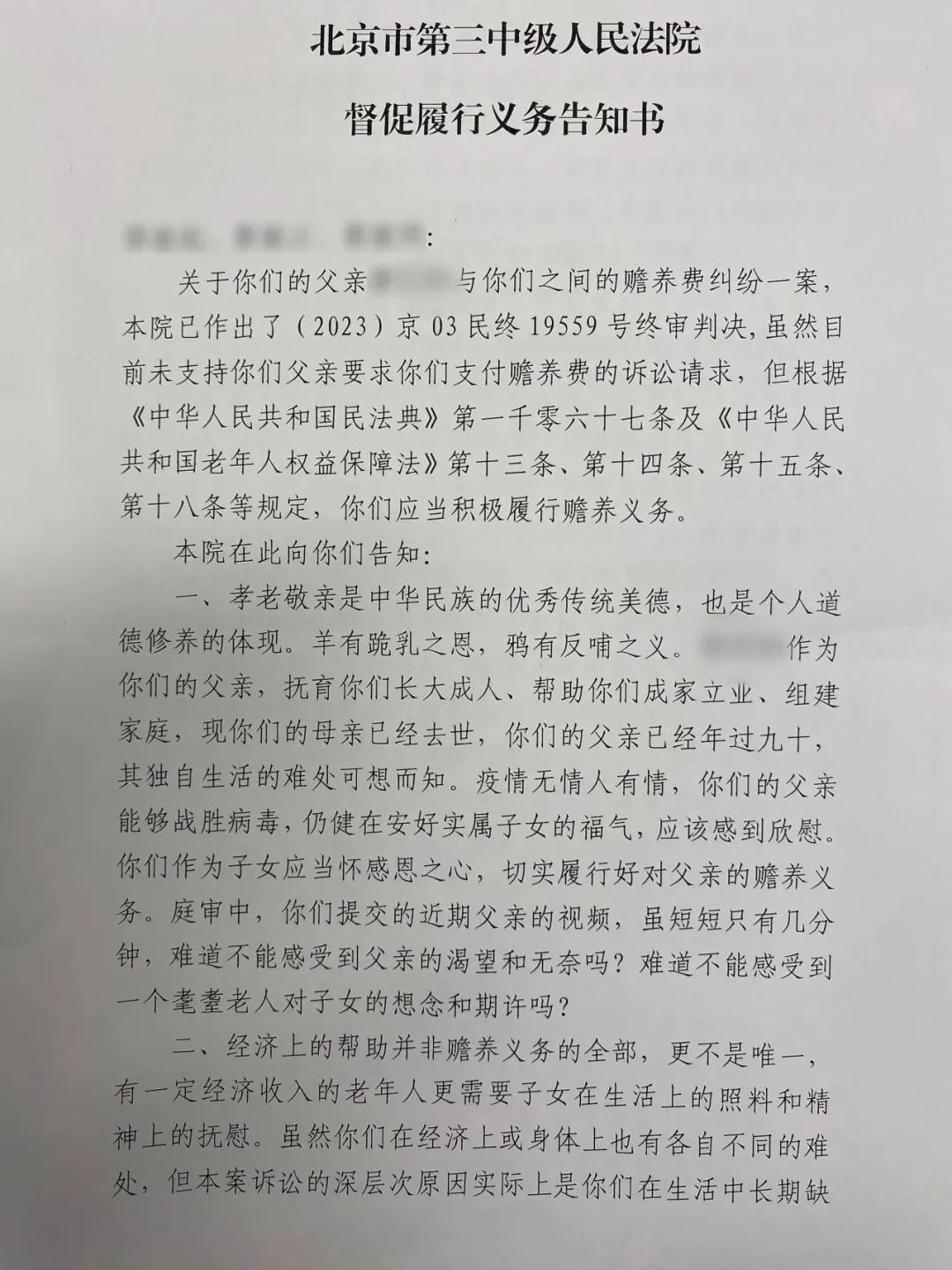 郭某与刘某是夫妻关系,刘某于2022年去世。二人育有子女四人,现郭某年已九十,由小女儿照顾,郭某起诉要求另外三子支付赡养费,其中郭某每月有退休金五千余元,大儿子居住在外地,二儿子肢体残疾,三儿子表示郭某现有收入并不需要子女支付赡养费。一审法院认为郭某尚不存在生活困难的情形,故对于郭某的请求未予支持。二审审理中,三个儿子前往郭某住处探望老人,老人表达希望子女多来陪伴的想法,二审法院虽未支持老人要求抚养费的主张,但指出如老人产生保姆费,可再行向子女主张相应费用,同时基于老人渴望子女陪伴的意愿,二审法院向郭某的儿子发出了《督促履行义务告知书》,要求其常回家看看,多与老人沟通交流,让老人感受到家人的温暖,安享晚年。经与郭某的儿子沟通,其均表示会按照告知书的要求常探望老人。