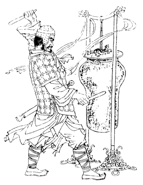 春秋时期《国语·吴语》中有记载“王乃秉枹,亲就鸣钟鼓、丁宁、錞于、振铎……其声动天地”。