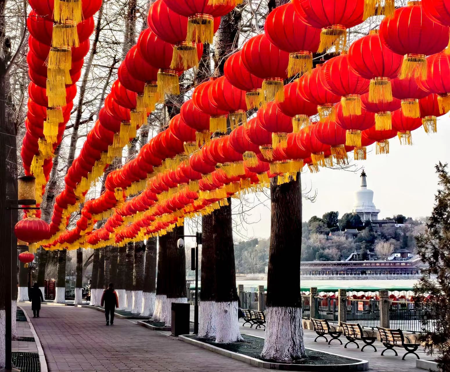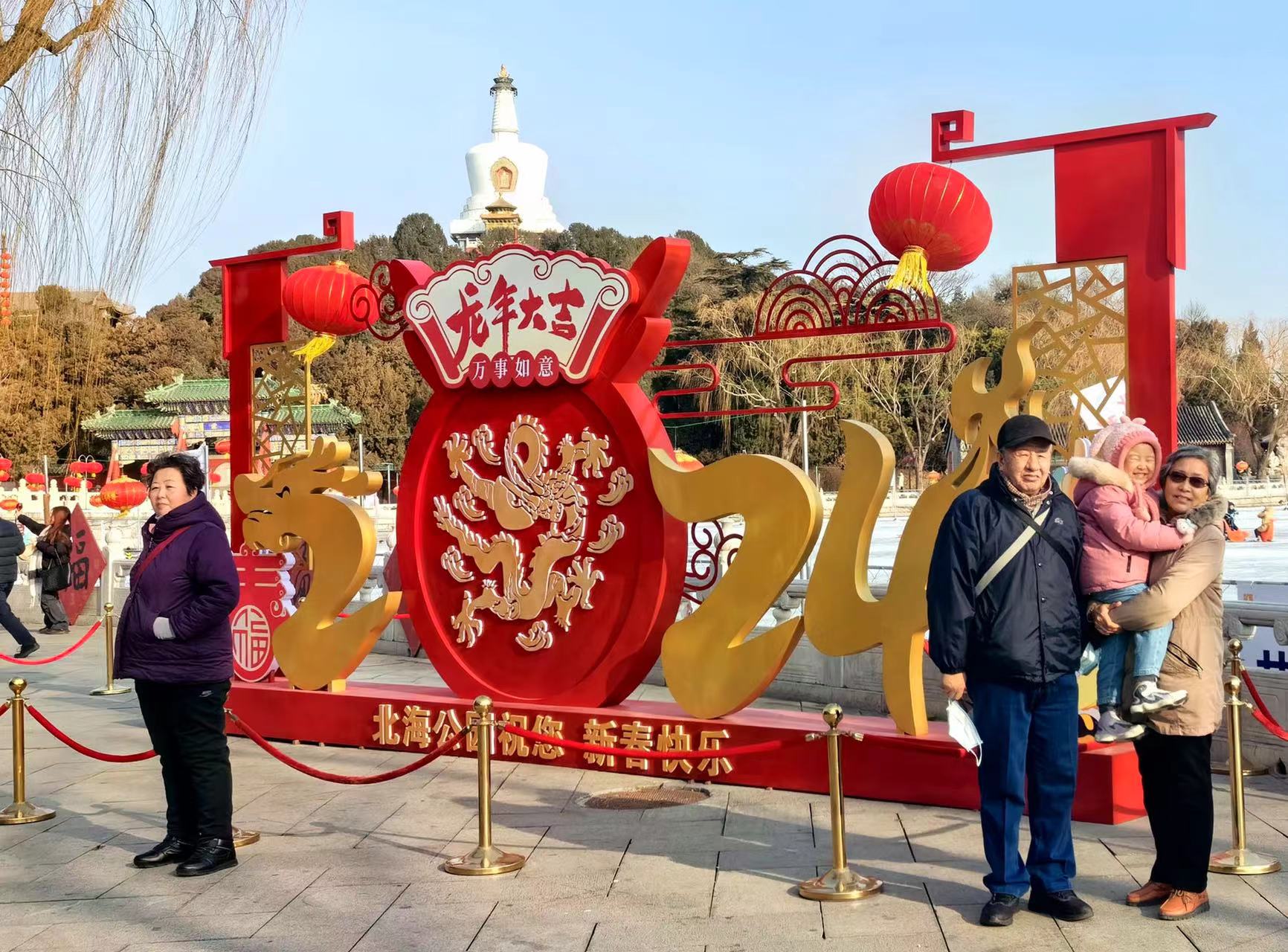 为迎接甲辰春节到来,北海公园以“九龙祈福”为主题的节日装饰覆盖全园主要路段及重点景区,共布置特色灯杆旗130 余面及景观小品3处、五福展板百余块、隆隆节日展板50余块、红灯笼共计 4500 余个,烘托出喜庆热烈的节日氛围。