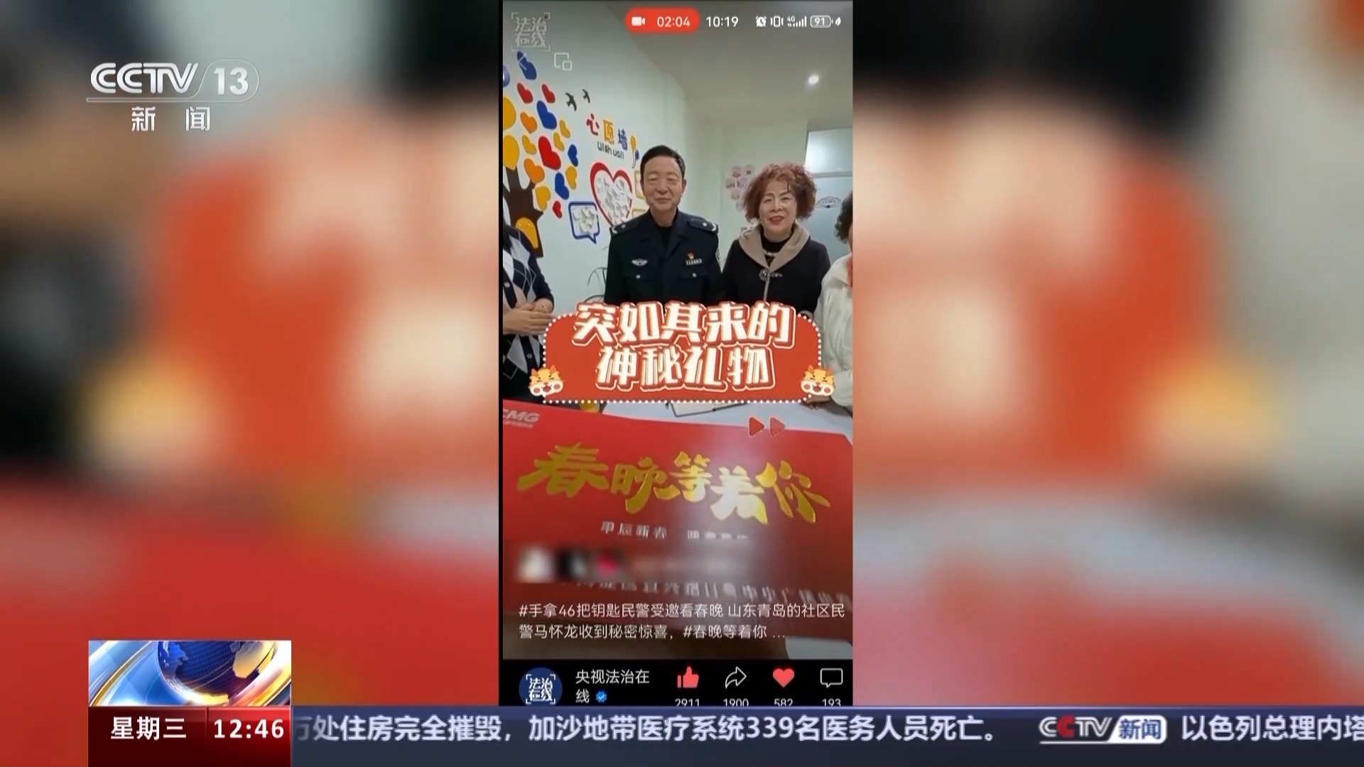 1月28日,总台央视春晚的第三次联排刚刚结束,在受邀的观众席上出现了一位身穿警礼服的民警,不少观众一眼认出,他正是刚刚获得2023年最美基层民警荣誉的青岛社区民警马怀龙。服务社区的16年来,他用付出收获了居民的信任。他常年照顾的46个独居、孤寡老人,都把他当作亲人。出发看春晚彩排前,老马像往年一样,准备逐家逐户去老人们家里跑一遍。