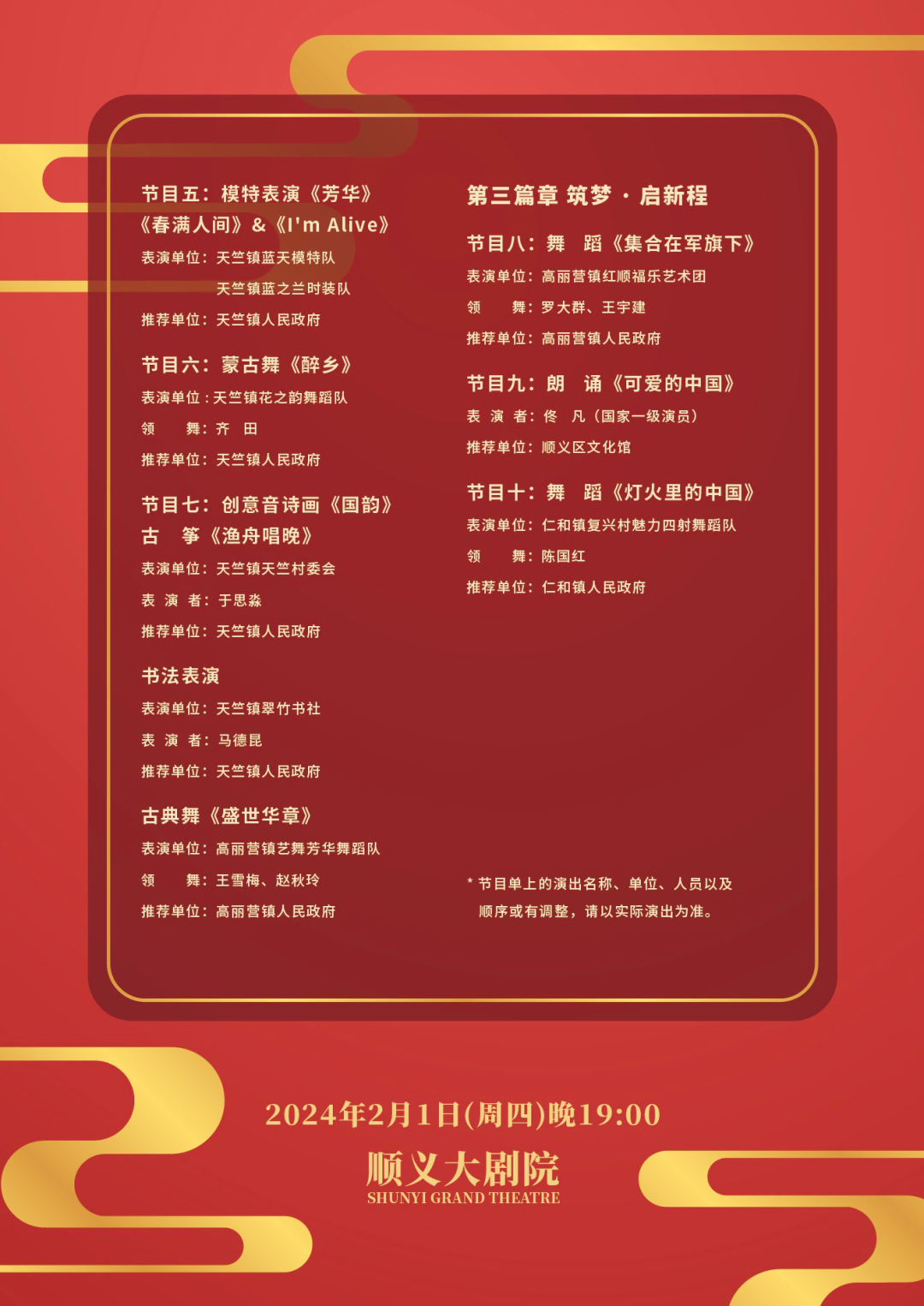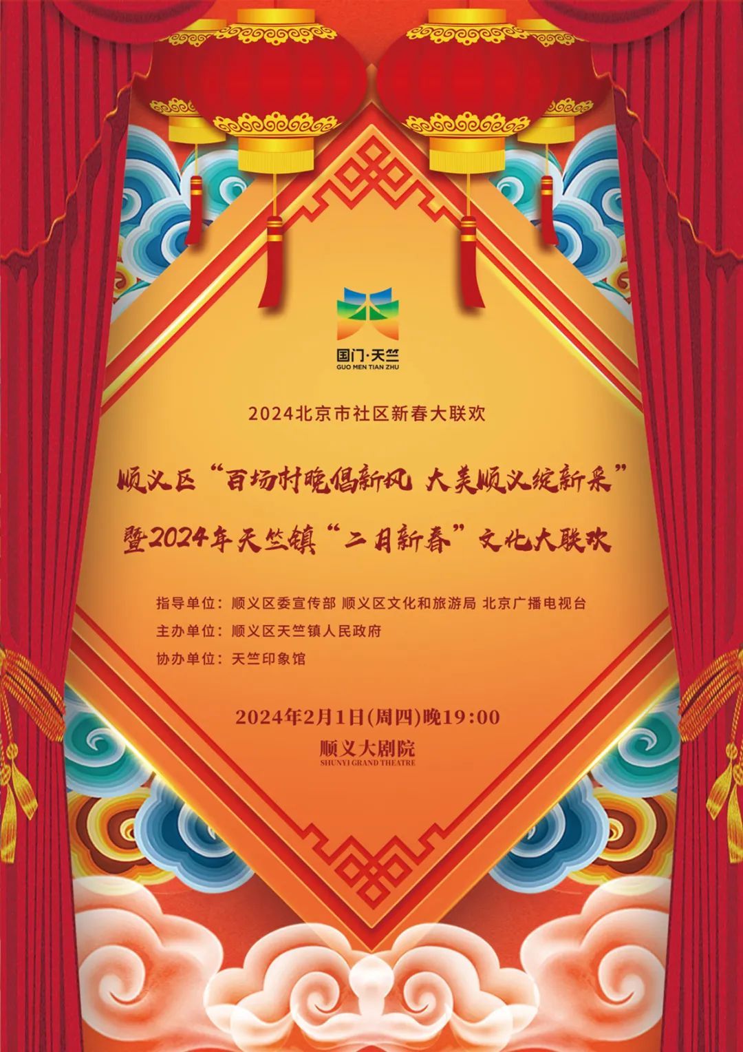 2024北京市社区新春大联欢——顺义区“百场村晚倡新风,大美顺义绽新采”暨2024年天竺镇“二月新春”文化大联欢将于2月1日晚在顺义大剧院上演,进一步营造欢乐喜庆、祥和文明的节日氛围。