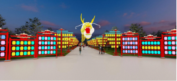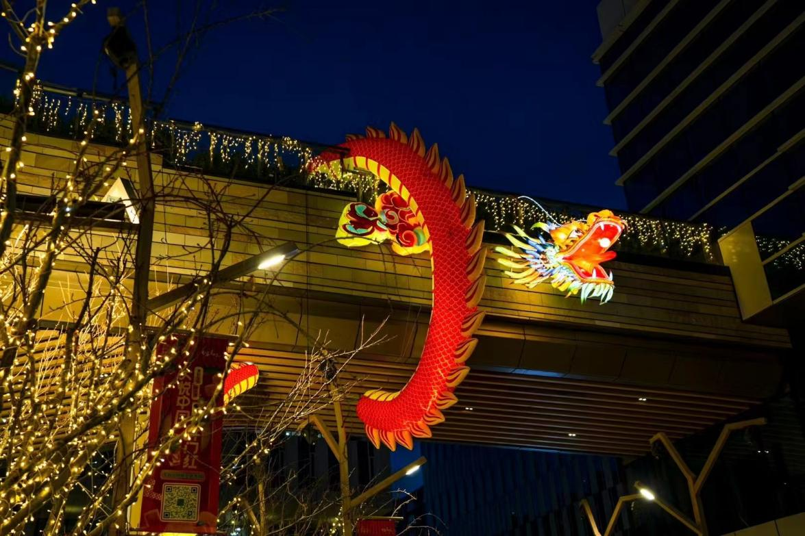 青龙湖以青龙为主设计体现出龙年的氛围,当夜幕降临,两条青龙腾空而起,一片灯海璀璨生辉。