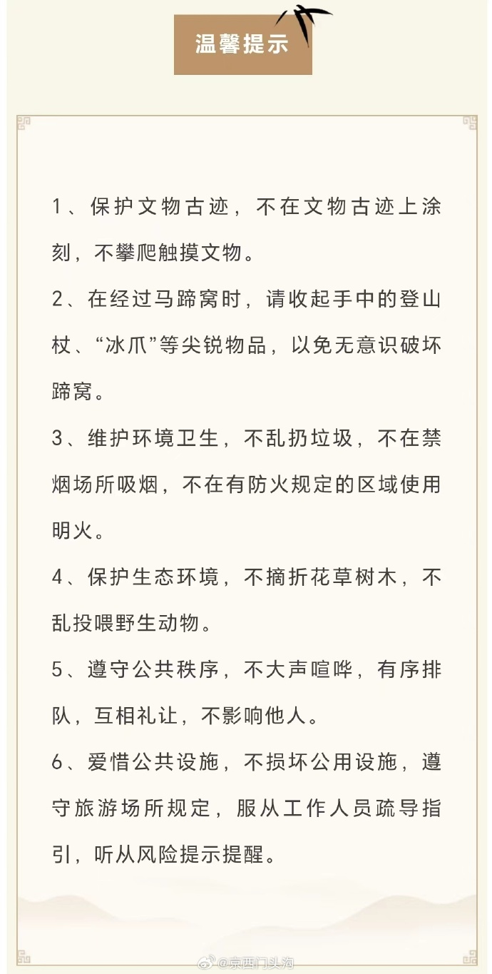 古道明珠——马蹄窝不仅是京郊保存最完好的文物级古道,也是中国十大古道之一,当我们行走在马蹄窝这条古道上时,更应该发扬文明旅游的精神,守护这片生态明珠,门头沟区文旅局温馨提示广大游客,文明出游 保护古迹,人人有责。