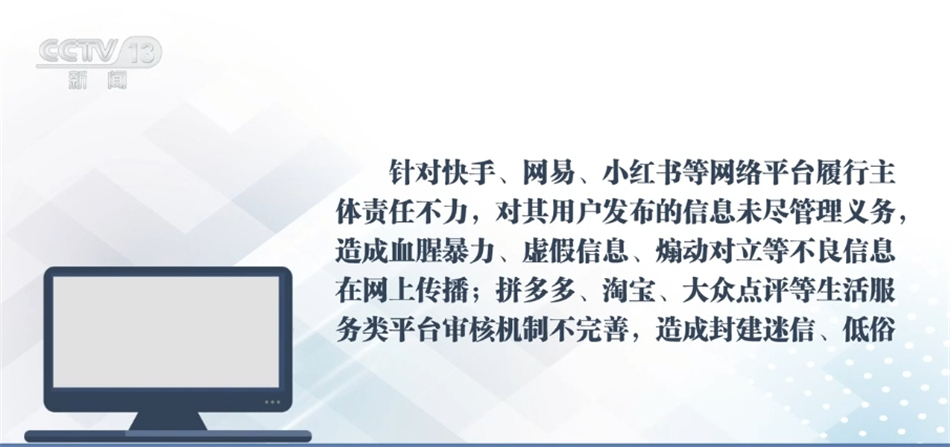 针对快手、网易、小红书等网络平台履行主体责任不力,对其用户发布的信息未尽管理义务,造成血腥暴力、虚假信息、煽动对立等不良信息在网上传播;拼多多、淘宝、大众点评等生活服务类平台审核机制不完善,造成封建迷信、低俗色情信息在网上传播等问题,国家网信办指导属地网信办分别依法约谈相关网站负责人,责令其限期整改,处置相关账号,从严处理责任人,并分别给予警告、罚款等行政处罚。