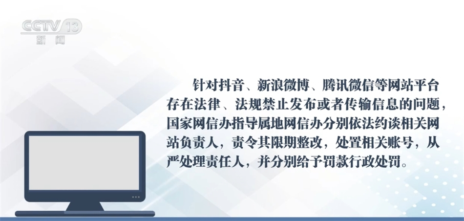针对抖音、新浪微博、腾讯微信等网站平台存在法律、法规禁止发布或者传输信息的问题,国家网信办指导属地网信办分别依法约谈相关网站负责人,责令其限期整改,处置相关账号,从严处理责任人,并分别给予罚款行政处罚。