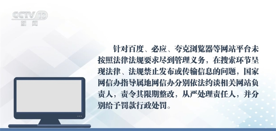 针对百度、必应、夸克浏览器等网站平台未按照法律法规要求尽到管理义务,在搜索环节呈现法律、法规禁止发布或传输的信息问题,国家网信办指导属地网信办分别依法约谈相关网站负责人,责令其限期整改,从严处理责任人,并分别给予罚款行政处罚。