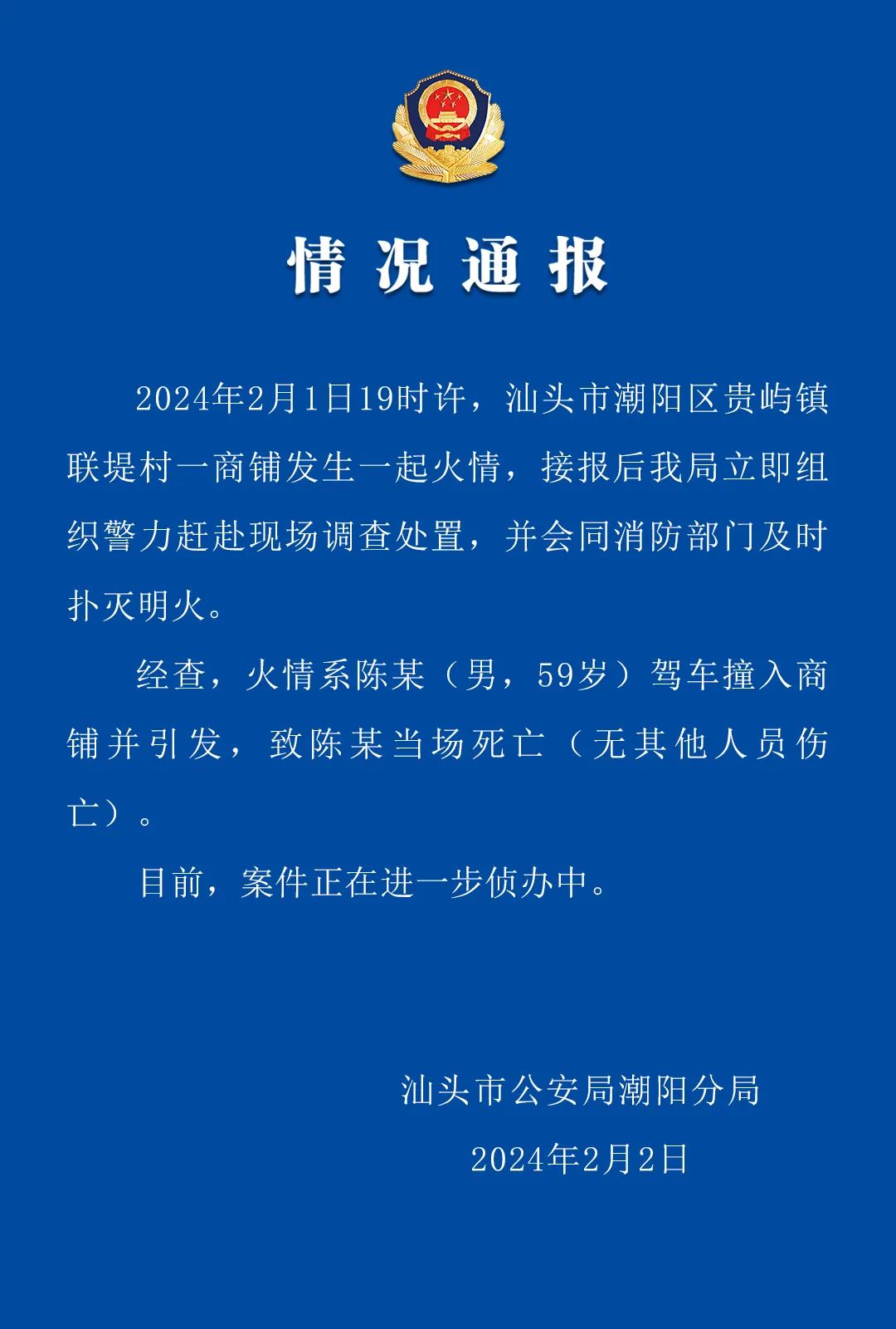 经查,火情系陈某(男,59岁)驾车撞入商铺并引发,致陈某当场死亡(无其他人员伤亡)。目前,案件正在进一步侦办中。