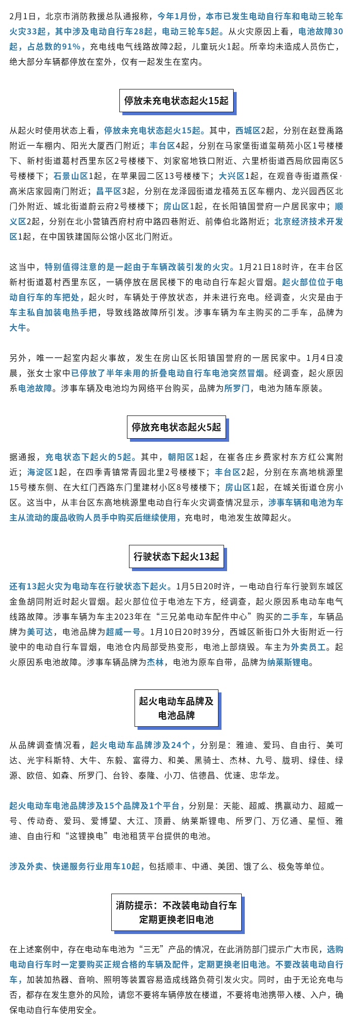 北京1月电动自行车、三轮车起火33起!消防通报涉事车及电池品牌