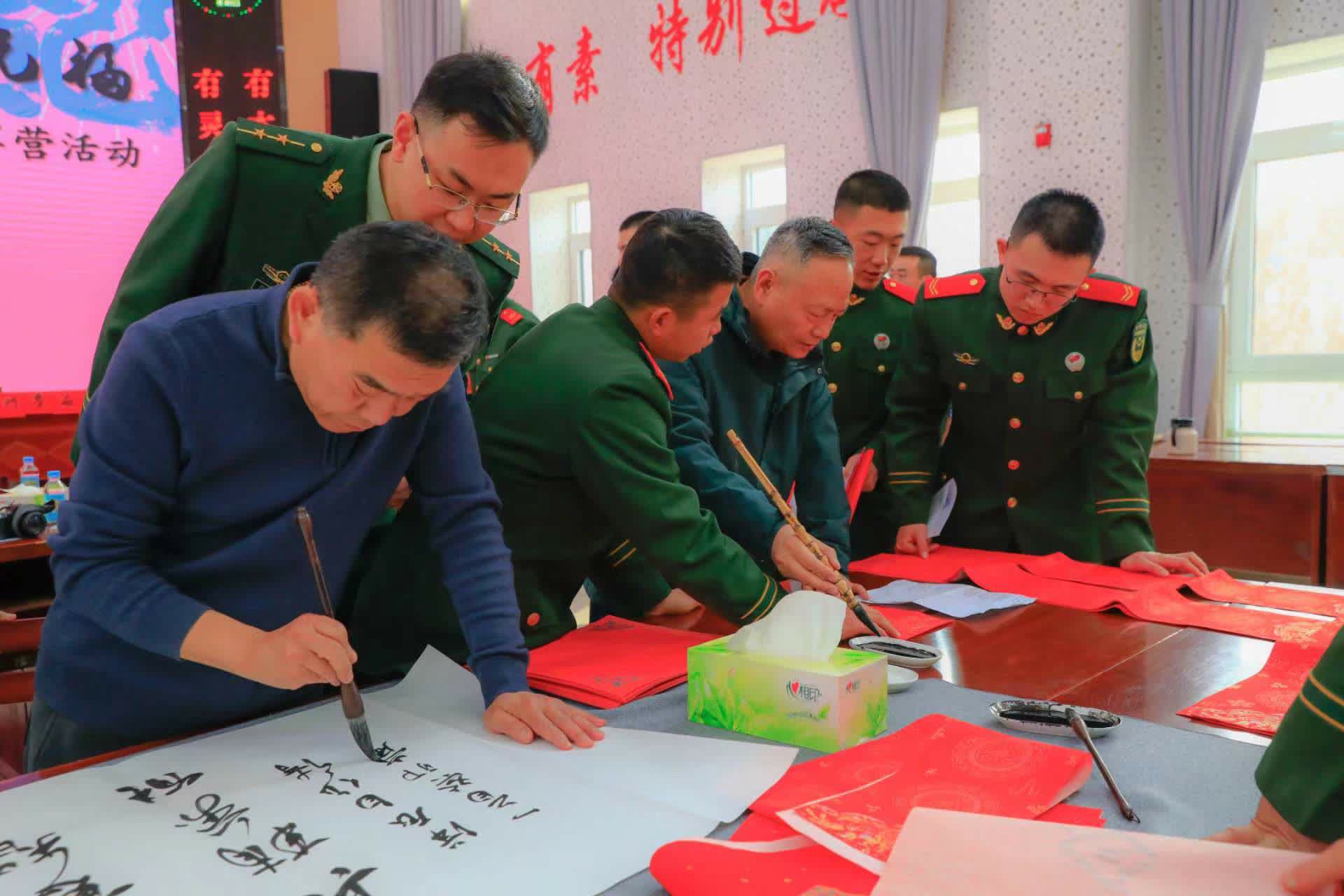 书法家们不顾严寒,一到支队就挥笔写春联福字。光荣传统光荣史;钢铁长城钢铁兵。民拥军意比泰山重,军爱民情似东海深;军民一家铁壁长城千里固;党政协力锦绣江山万年春。翰墨飘香,暖意浓浓,这些作品凝聚了书画家们对武警官兵的新春祝福与节日问候。