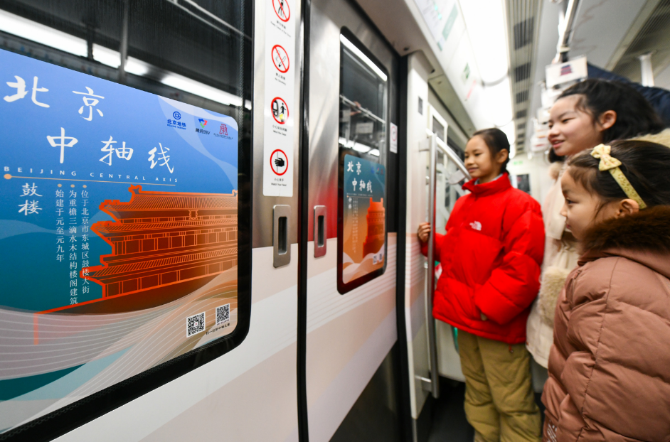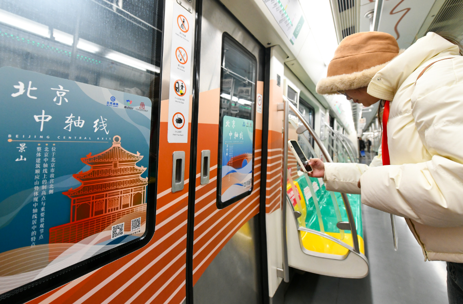 北京地铁运营服务管理部主管曹琼介绍,专列外观、内饰的设计在融入北京中轴线15个特色建筑元素基础上,还融合了数字化内容和体验,乘客可以通过扫码“云上中轴”小程序,在线感受北京中轴线文化遗产风貌。
